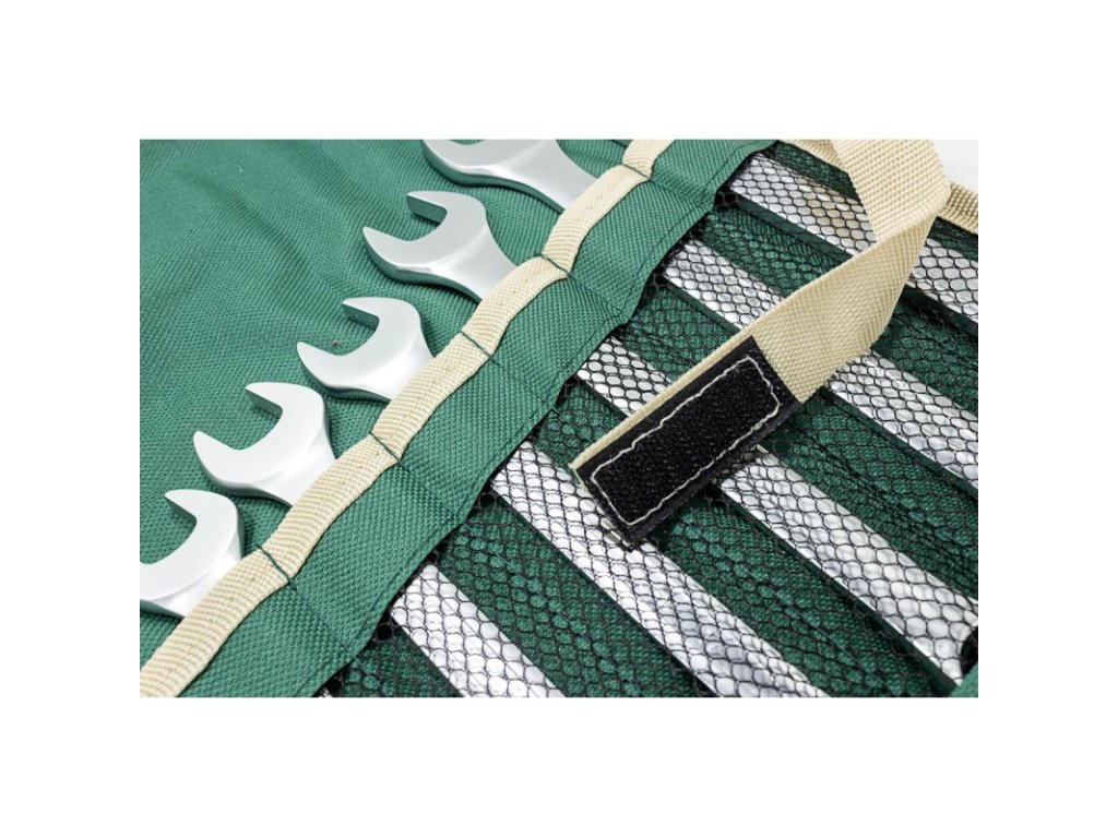 Súprava plochých očkových kľúčov vyrobených z ocele CrV , zabalená v textilnej rohoži s očkami na zavesenie na stenu.