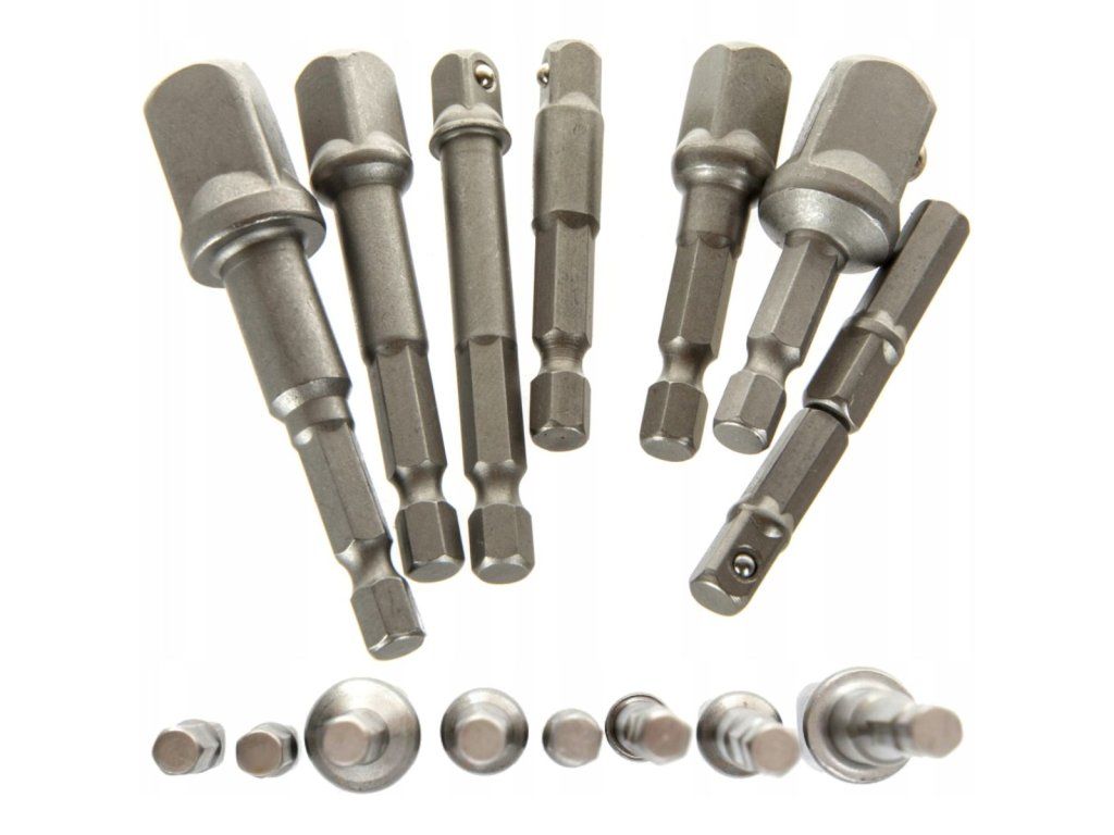 Sada špecializovaných redukcií a adaptérov pre vŕtačky. Redukcie umožňujú prácu s vŕtačkou pomocou nástrčných kľúčov. Súčiastky sú vyrobené z nástrojovej ocele, ktorá zaručuje ich pevnosť a dlhú životnosť.