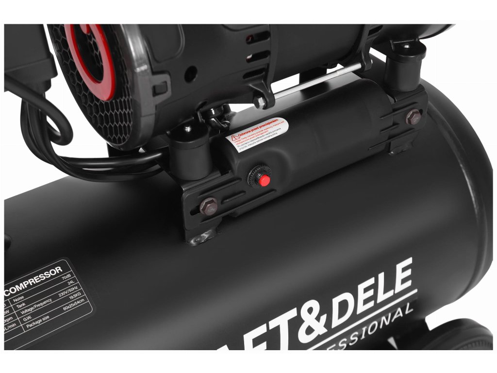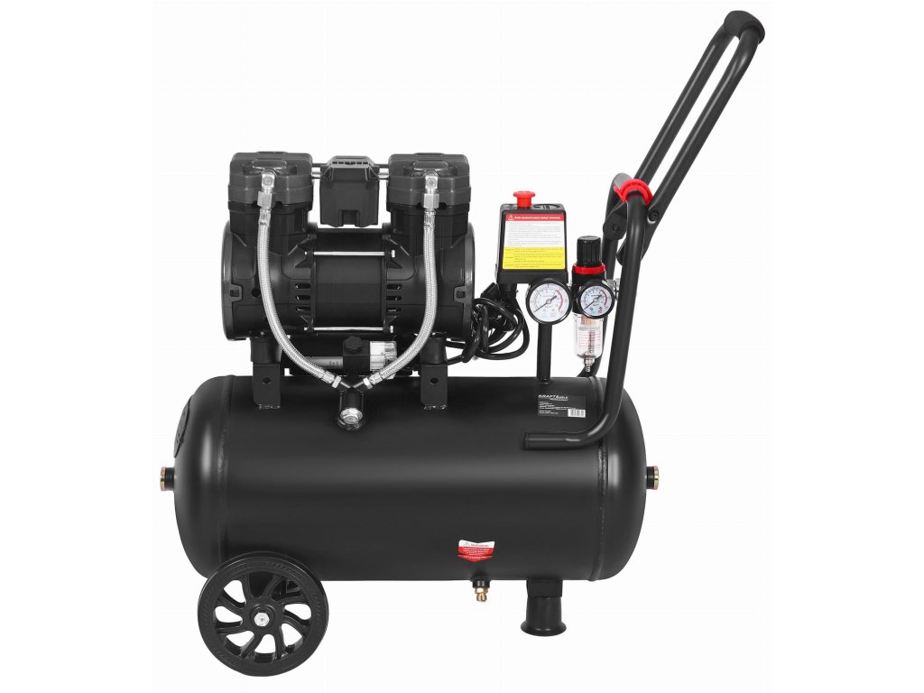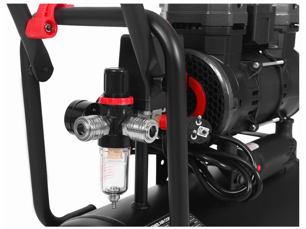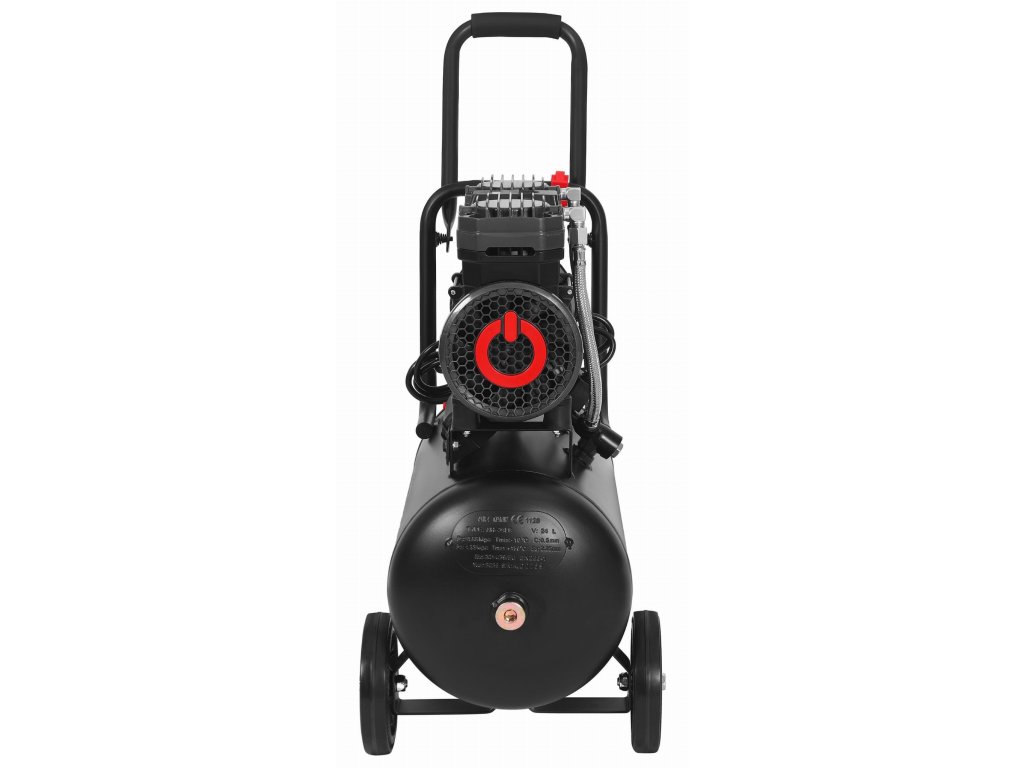 Kompresor spája vysoký výkon s maximálnou mobilitou a jednoduchou obsluhou. Vďaka bezolejovej konštrukcii pracuje čisto a bez nárokov na údržbu, čo z neho robí ideálneho pomocníka v garáži, dielni aj pri montážnych prácach v teréne. Motor s výkonom 1450 W zaisťuje prietok vzduchu až 249 l/min, čo bohato postačí pre väčšinu bežných pneumatických nástrojov. Sklopné držadlo potiahnuté mäkkým materiálom, veľké kolieska a tichá prevádzka 70 dB prinášajú komfort a ľahký transport. Vďaka dvojici manometrov, odvodňovaču s reduktorom tlaku a ochrane proti preťaženiu je obsluha kompresora bezpečná a presná.