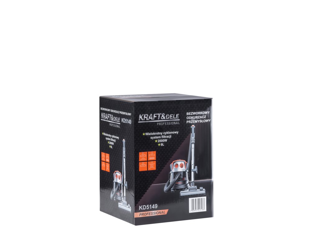Bezvreckový priemyselný vysávač KD5149 značky Kraft&Dele . Vysávač spĺňa európske normy a zároveň je veľmi výkonný. Výkonný elektrický motor umožňuje bez problémov vysávať všetky typy nečistôt. Kolieska umiestnené na základni uľahčujú presun zariadenia počas práce. Vysávač má viacnásobný cyklónový filtračný systém. V balení sú celkom 4 čistiace nástavce.
