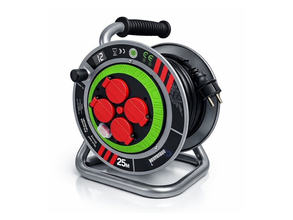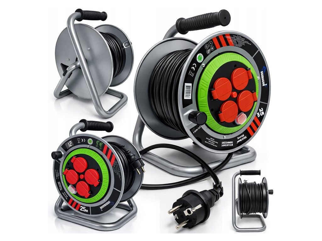Bubnový predlžovací kábel 25 m, 3×2,5 mm², IP44, 4 zásuvky, kovový rám