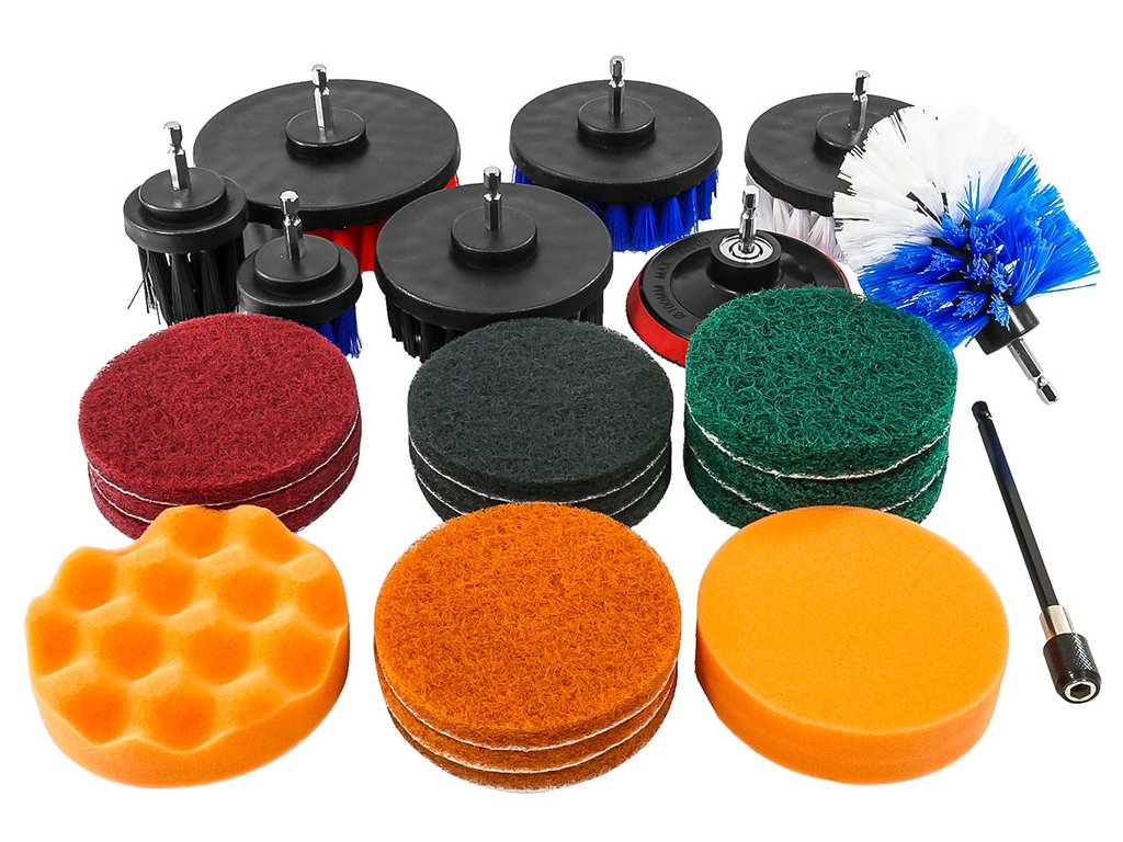 Vysoko kvalitná sada umývacích a kefovacích kief . Sada obsahuje kefy rôznych veľkostí a hrubostí, čo umožňuje dôkladné čistenie veľkých plôch, ale aj malých zákutí. Štetiny kief sú vyrobené z nylonových vlákien, ktoré nepoškriabu povrchy. Navyše sú štetiny odolné proti práci pri veľmi vysokých otáčkach.
