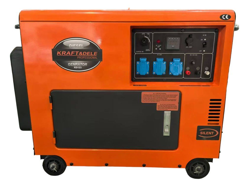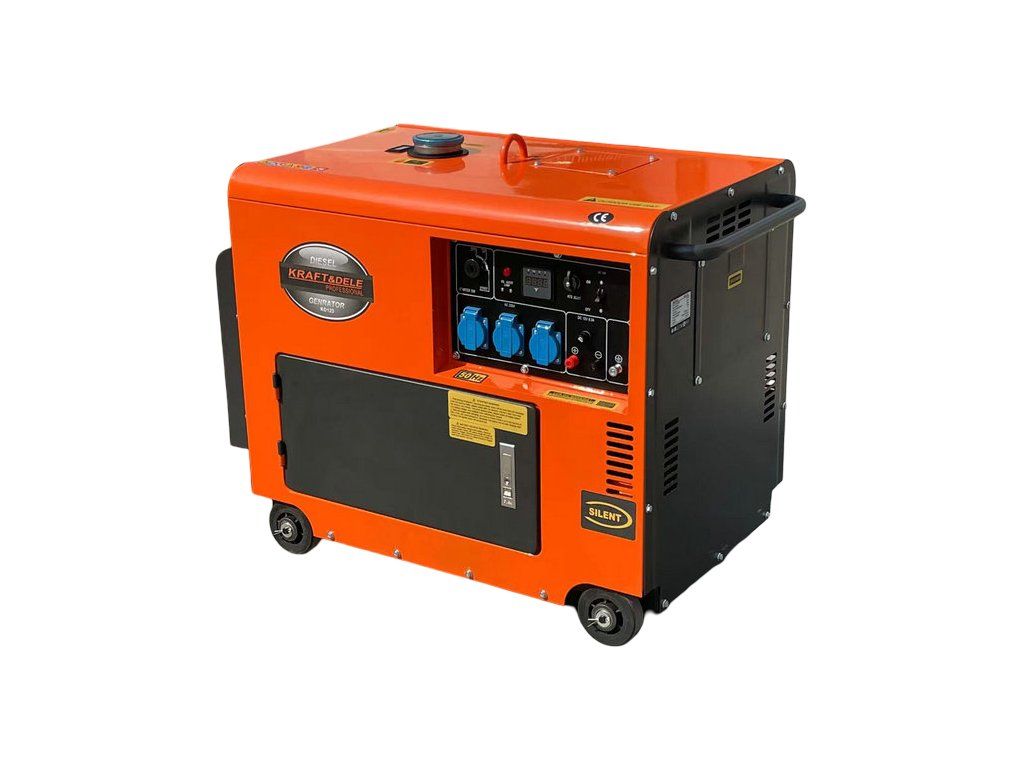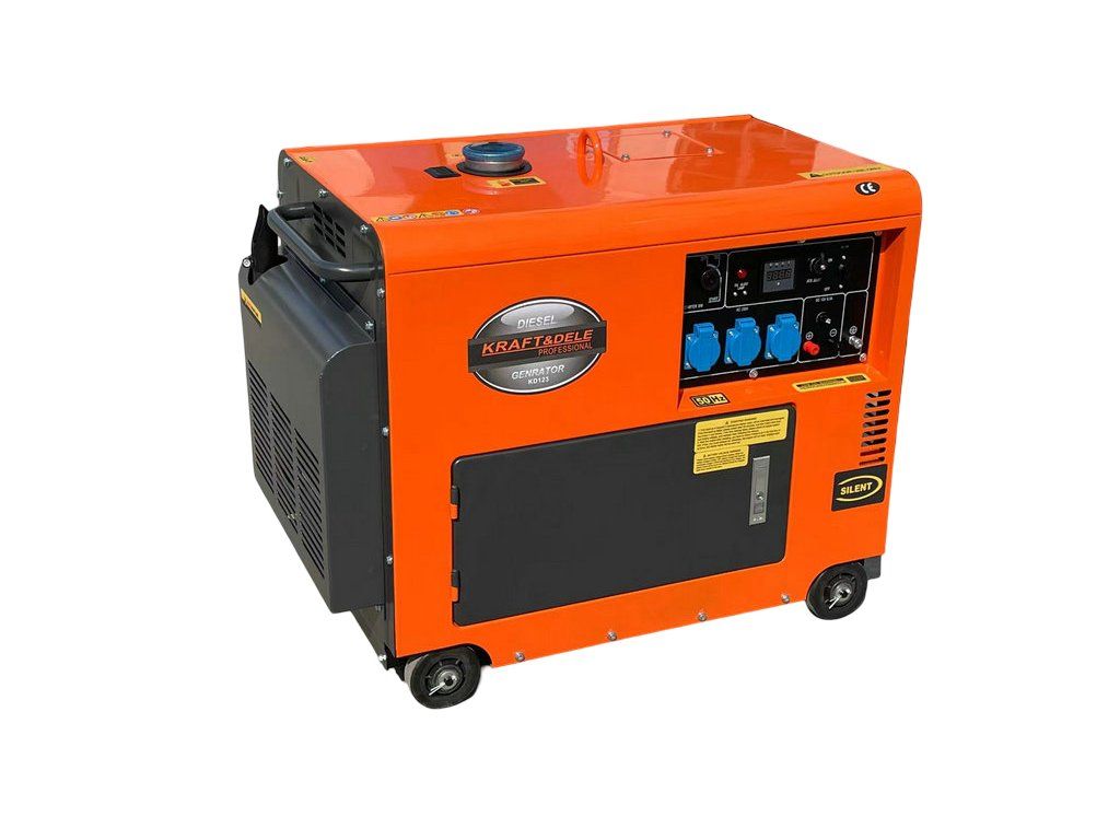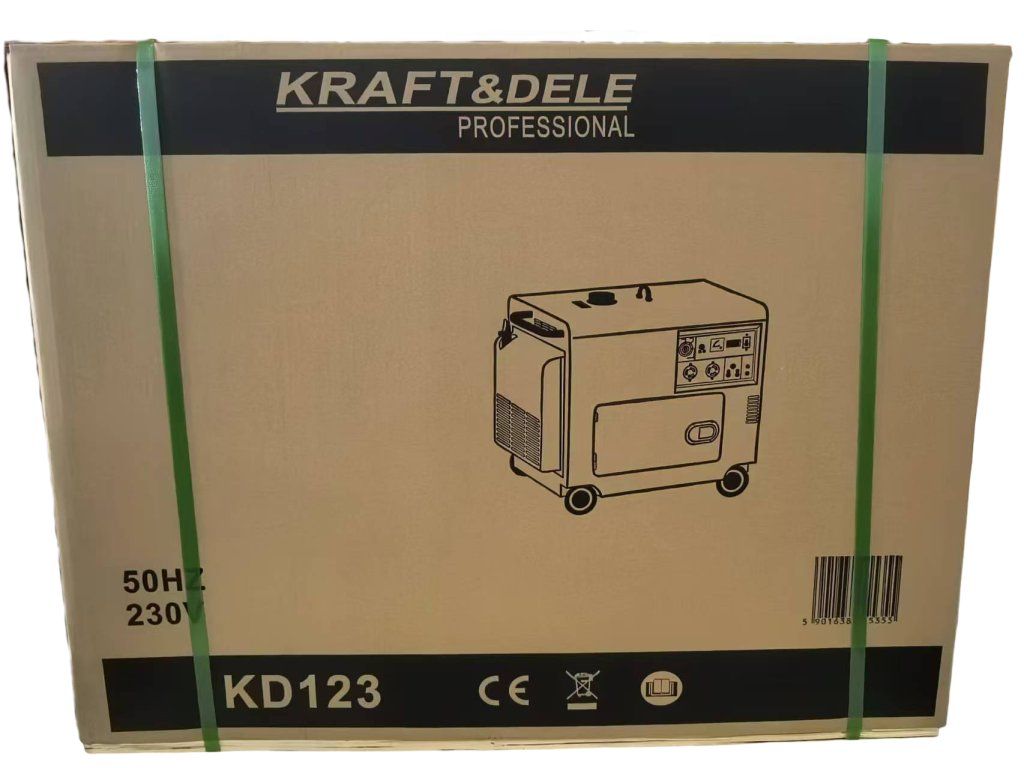 Jednofázový dieselový generátor s ATS KD123 značky Kraft&Dele je určený na výrobu striedavého prúdu 220–230 V pomocou výkonného dieselového spaľovacieho motora a generátora s výkonom 7000 W. Generátor je ideálny pre použitie na stavbách, v prevádzkach alebo všade tam, kde je potrebný stabilný a silný zdroj elektrickej energie. Motor disponuje chrómovaným piestom, vďaka čomu pracuje veľmi ticho a rovnomerne a zároveň je úsporný. Gumené stabilizátory a motorové podložky zabezpečujú tlmenie vibrácií a minimalizáciu hluku. Zariadenie je vybavené elektrickým štartérom, voltmetrom, výstupom 12 V na nabíjanie akumulátora, regulátorom napätia AVR a automatickým prepínačom (ATS), ktorý umožňuje automatický chod generátora. Udržiava konštantné výstupné napätie bez ohľadu na zaťaženie.