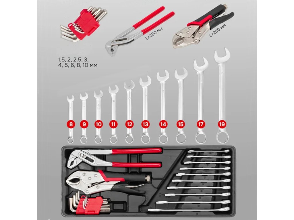 Táto časť sady je určená na bežné mechanické a inštalatérske práce. Kombinované kľúče z Cr-V sú veľmi odolné a doplnkové kliešte a imbusové kľúče zvyšujú univerzálnosť sady.