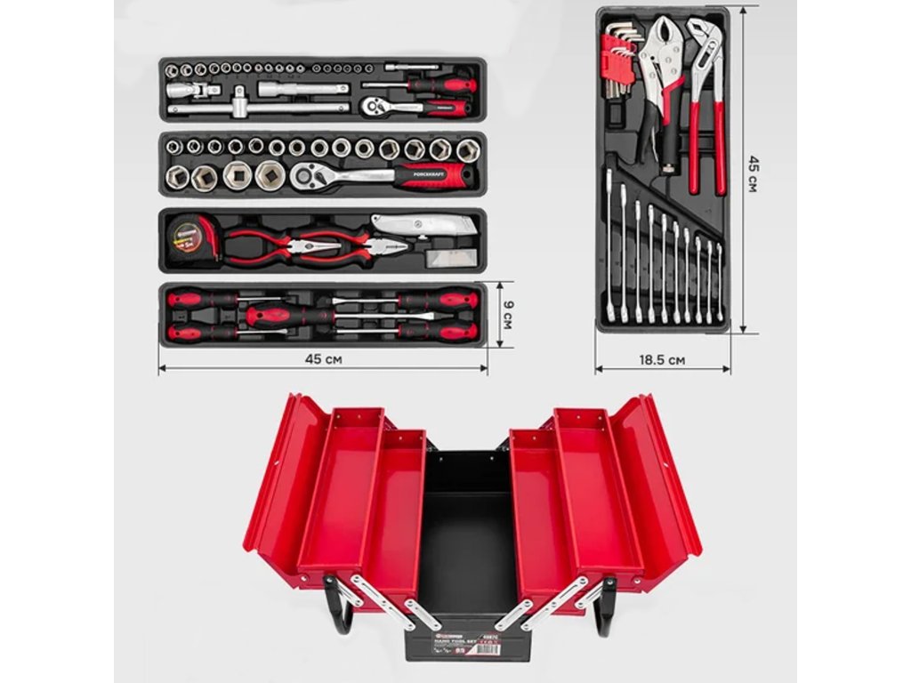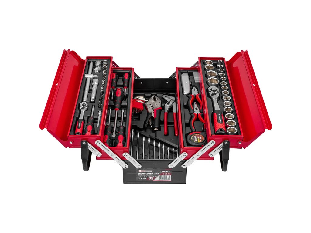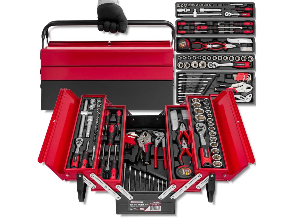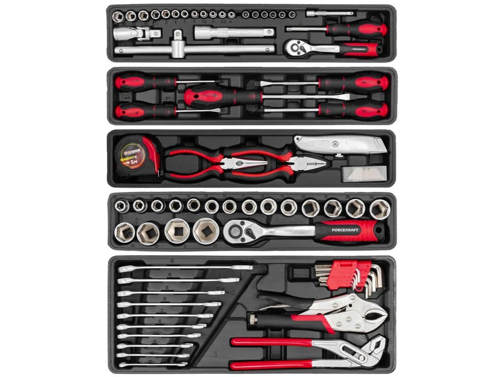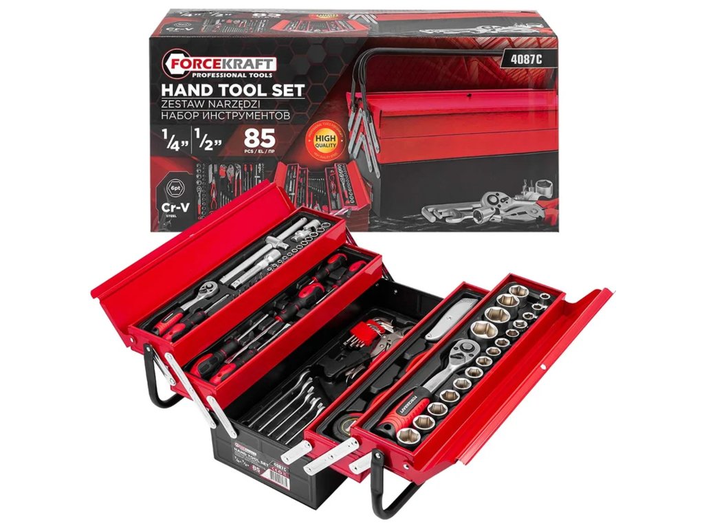 Sada náradia Forcekraft 85 kusov je kompletné riešenie pre mechanikov, domácich majstrov i všetkých, ktorí hľadajú univerzálne a odolné vybavenie do dielne. Náradie je vyrobené z chróm-vanádiovej ocele (Cr-V) , čo zaručuje dlhú životnosť, odolnosť proti mechanickému poškodeniu a intenzívnemu používaniu. Všetko je uložené v pevnej kovovej kazete na náradie s rozkladacími policami , ktorá umožňuje pohodlnú organizáciu a rýchly prístup ku všetkým položkám.