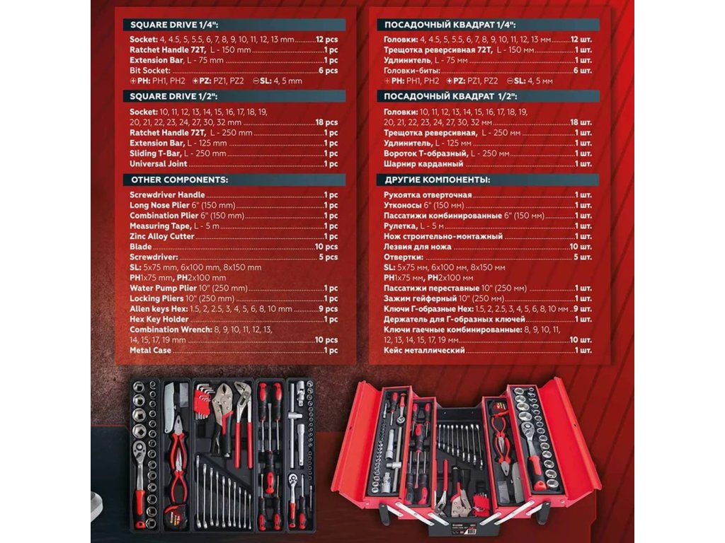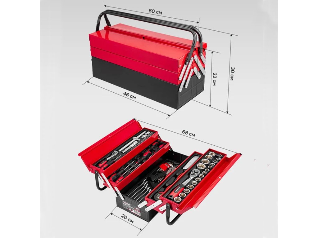 Celá súprava je umiestnená v odolnom kovovom kufri s rozkladacím systémom políc, ktorý umožňuje okamžitý prístup k náradiu a udržanie dokonalého poriadku. Použitie silnej ocele a pevných pántov zaručuje dlhú životnosť kufra a ergonomická rukoväť umožňuje pohodlné prenášanie.