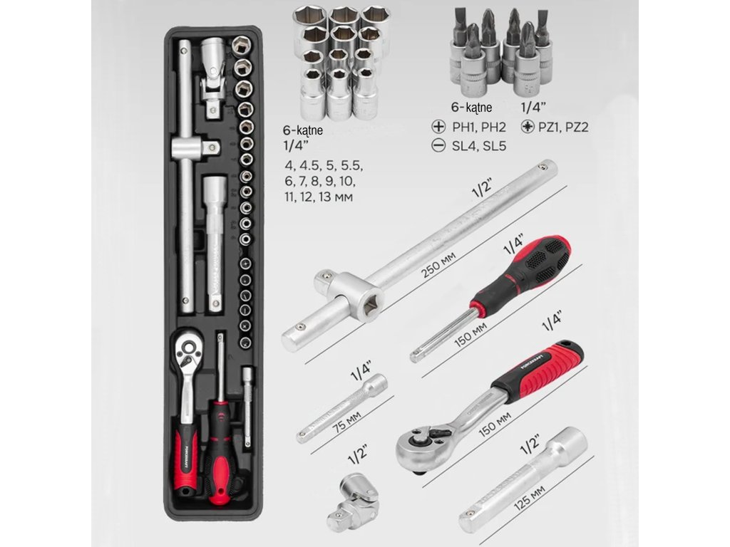 Nástrčné hlavice a kľúče pokrývajú rozmery od 4 mm do 32 mm, čo umožňuje pracovať ako s drobnými skrutkami, tak s veľkými závitovými spojmi. Vďaka tomu je sada univerzálna a hodí sa pre mnoho oblastí – od presných opráv elektroniky až po prácu na väčších automobilových prvkoch.