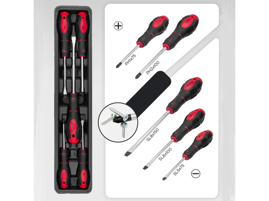 Skrutkovače majú ergonomické rukoväte s protišmykovými vložkami, čo zaisťuje pevný úchop a presnosť práce. Vďaka pevným hrotom sú odolné proti deformáciám a opotrebovaniu.
