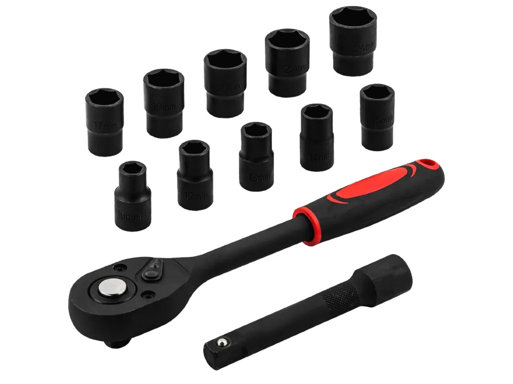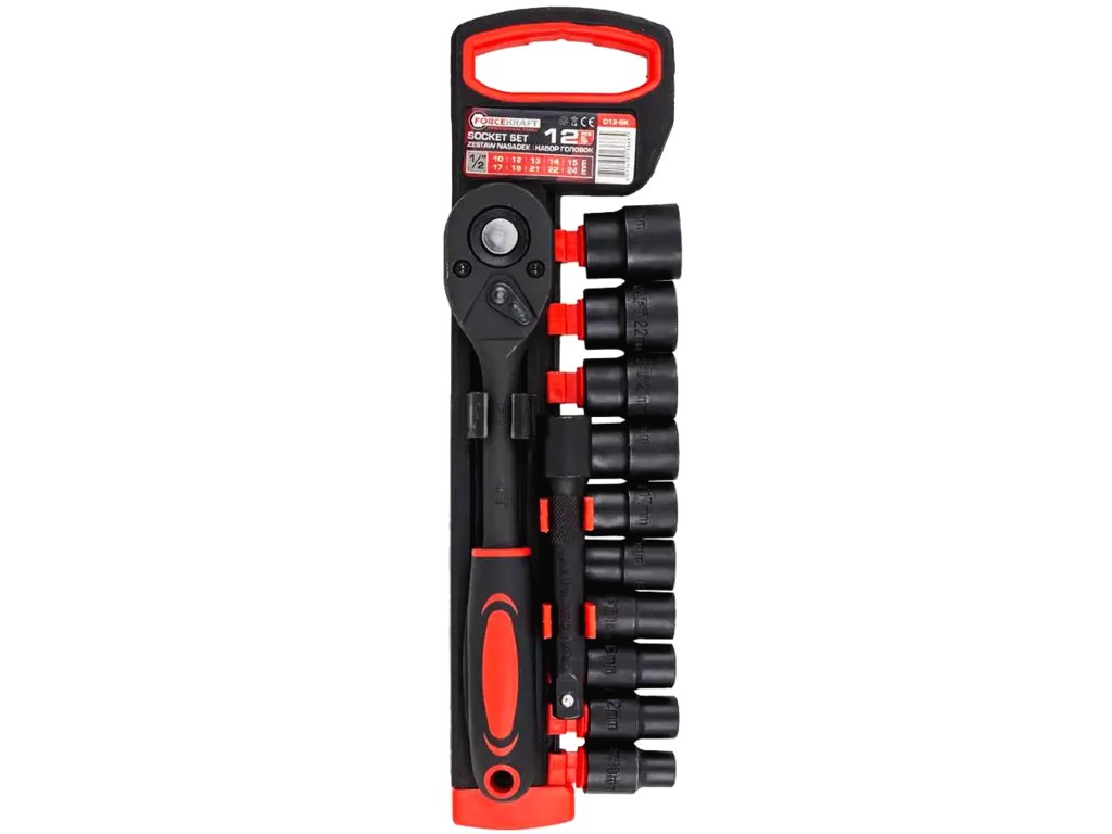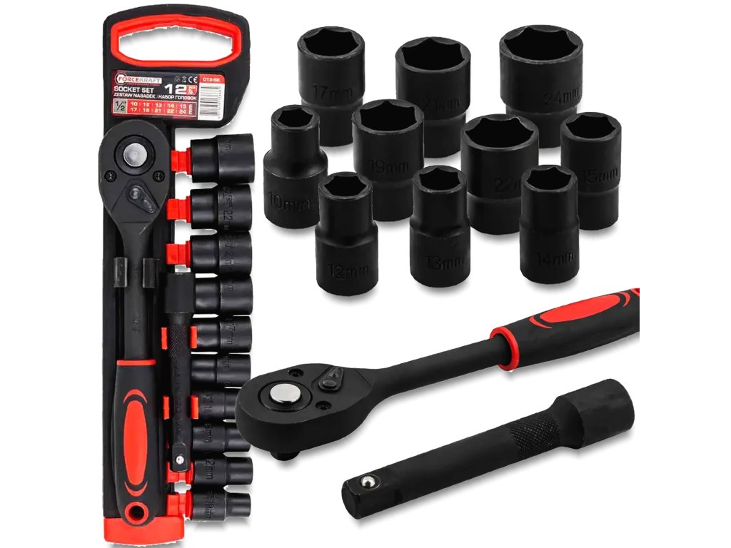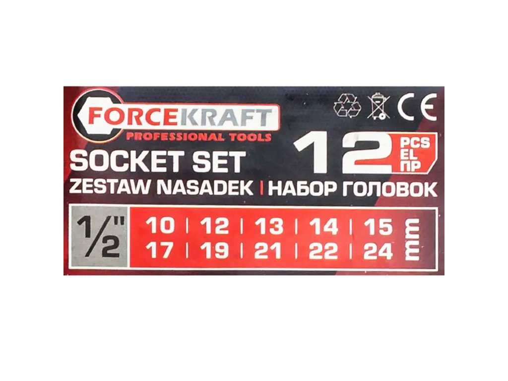 FORCEKRAFT sada nástrčných hlavíc 1/2" s račňou a predlžovacím nástavcom, 12 ks, 10–24 mm