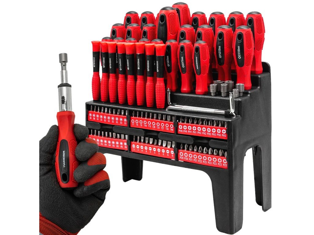 Súprava skrutkovačov a bitov 100 dielov značky Forcekraft je univerzálnym riešením pre domácich majstrov, servisných technikov i profesionálov, ktorí potrebujú široký výber nástrojov pre prácu s rôznymi druhmi a rozmermi spojovacieho materiálu. Obsahuje bohatú ponuku skrutkovačov, bitov, nástrčných hlavíc a držiakov, čo z nej robí kompletné vybavenie do dielne, garáže aj na domáce použitie.