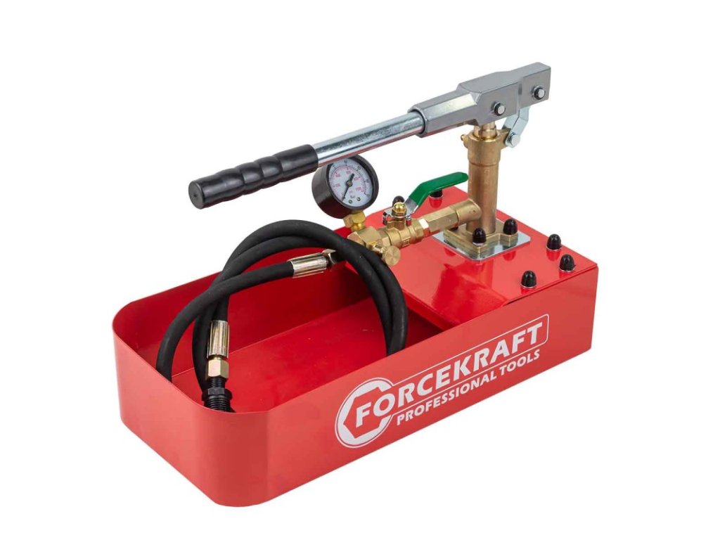 FORCEKRAFT tlaková skúšobná pumpa je presný nástroj určený na vykonávanie tlakových skúšok a skúšok tesnosti v inštaláciách, s možnosťou použitia vody alebo oleja ako skúšobnej kvapaliny pri maximálnom skúšobnom tlaku 70 bar .