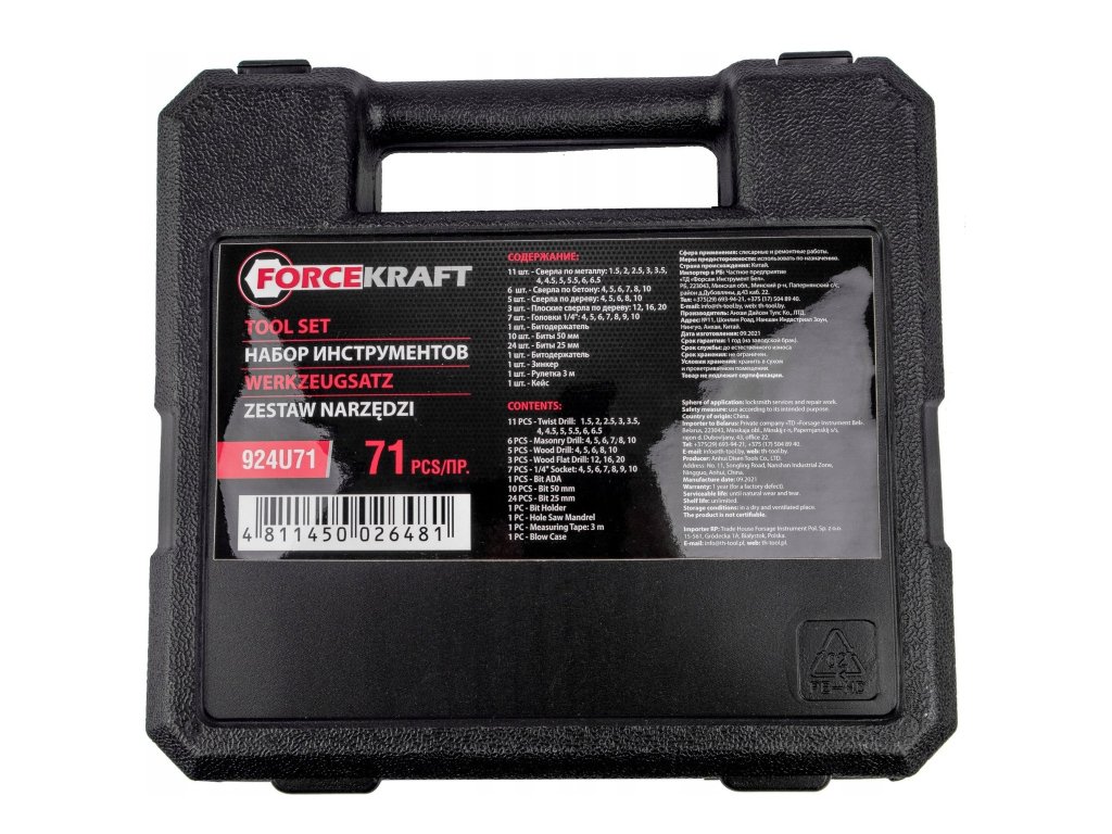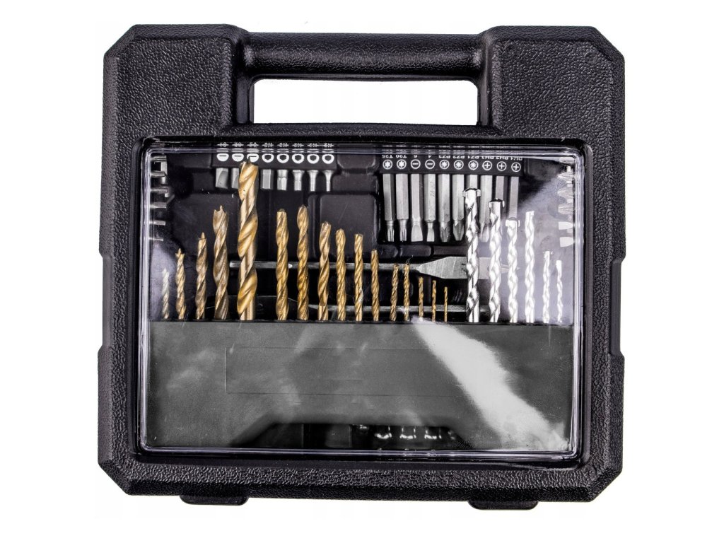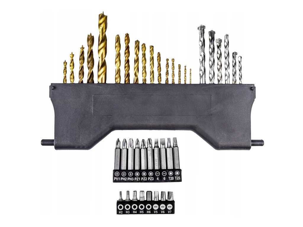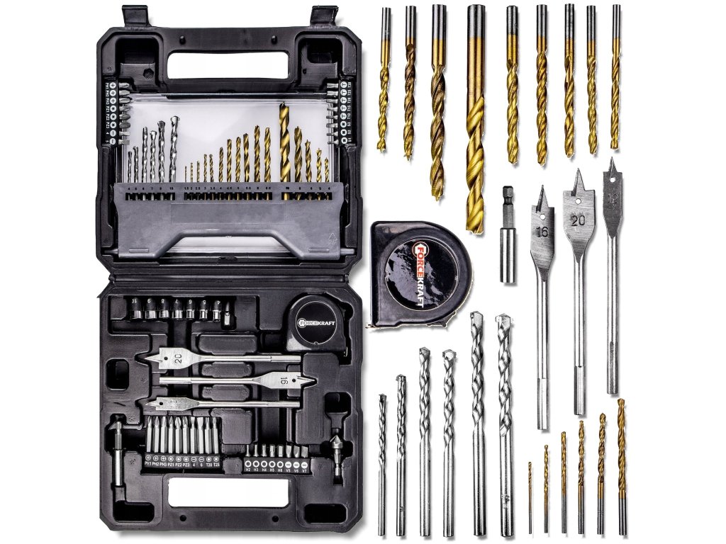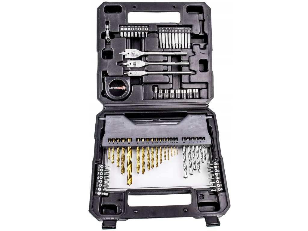 Obsahuje celkom 71 dielov : kompletná sada vrtákov pre kov, drevo a betón, ďalej bity, nástrčné hlavice, adaptéry, kužeľový zahlbovač a zvinovací meter. Každý diel má svoje miesto v praktickom a pevnom plastovom kufríku, čo zaisťuje poriadok a ľahký prístup k náradiu.