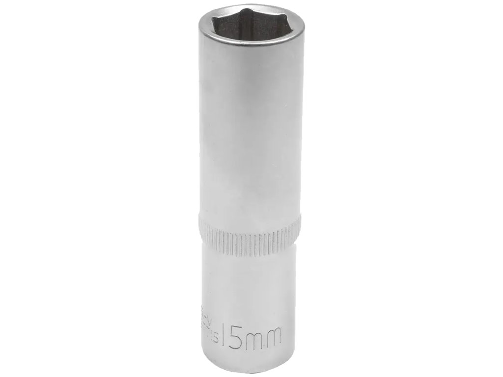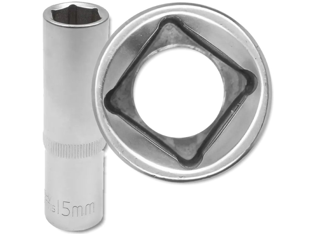 Hlboká nástrčná hlavica 1/2" 15 mm (šesťhranná) je nenahraditeľný nástroj určený na prácu s pevne utiahnutými matkami a skrutkami, najmä ak sú spojovacie prvky umiestnené v hlbokých sedlách alebo na dlhých čiapkach. Vďaka predĺženej konštrukcii a presnému momentu alebo hraniu pri hrane a šesťhrannom profile umožňuje spoľahlivé prenášanie.