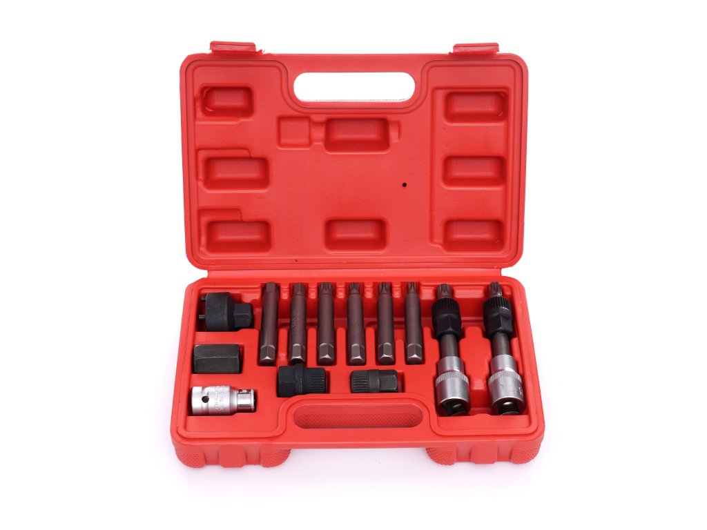 Sada 13 dielov pre montáž a demontáž alternátorov so spojkou. Kľúče v sade umožňujú súčasné uvoľnenie skrutky upevňujúcej kladku a zároveň zafixovanie kolesa so spojkou. Takáto sada je nevyhnutným vybavením každej dielne.