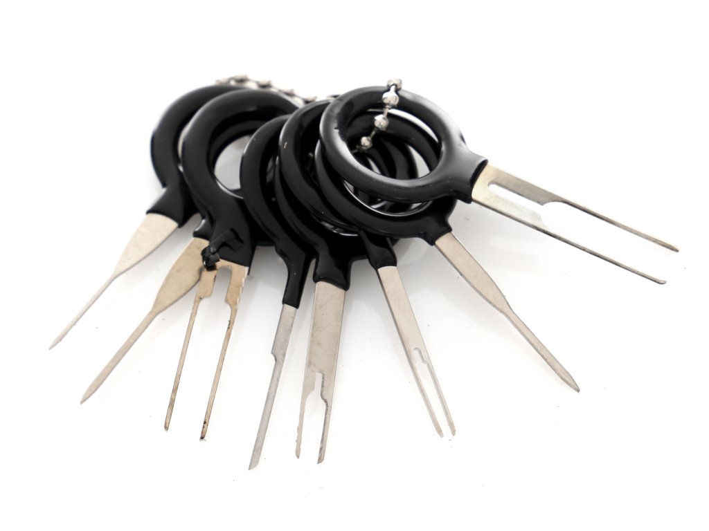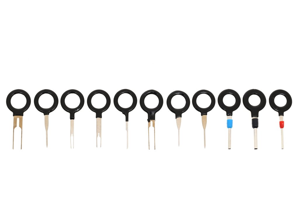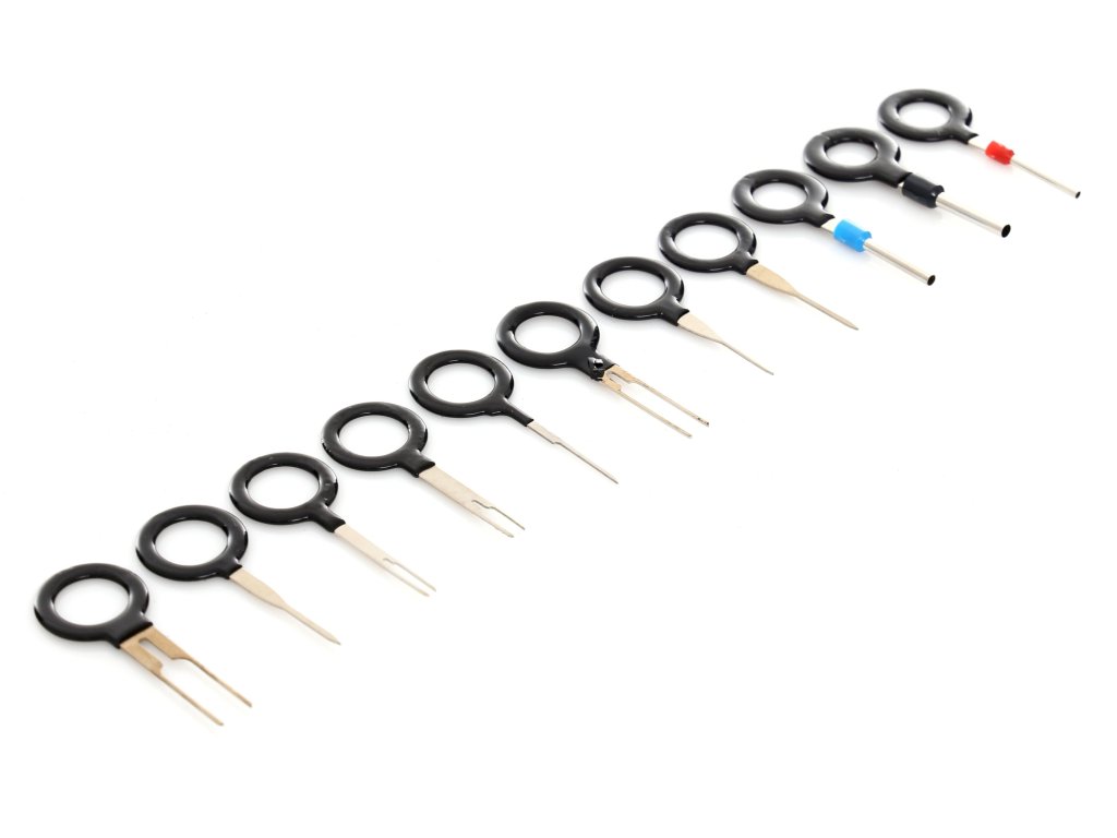 Obsah balenia: 11 kľúčov na demontáž pinov a konektorov. Rukoväť je potiahnutá gumou, čo zvyšuje pohodlie pri práci. Táto sada je nevyhnutným vybavením každého elektrikára a elektronika. Je mimoriadne užitočná pri úpravách a opravách elektrických inštalácií v automobiloch, na motocykloch, lodiach, ako aj doma pri opravách spotrebičov, audiovizuálnej techniky alebo počítačov. Kľúče na vyberanie majú ergonomický tvar, čo uľahčuje demontáž. Je možné pracovať aj s polámaným pinom alebo ohnutým plechom konektora. A čo je najdôležitejšie - kľúče na vyberanie nenarušujú piny.