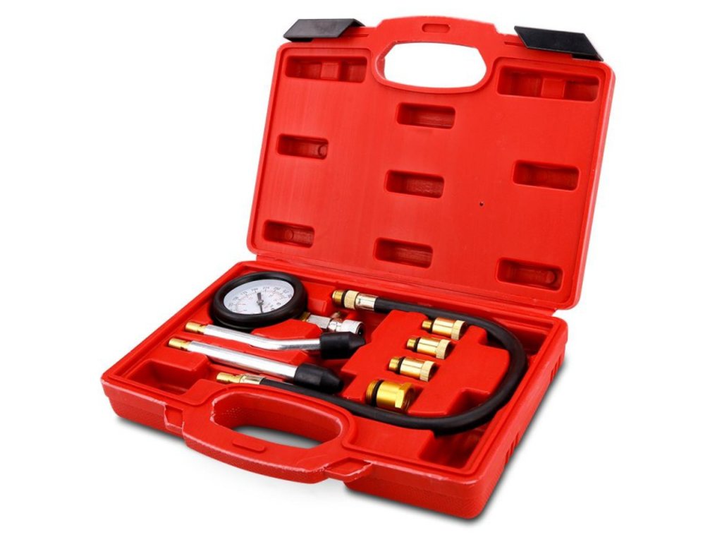 Súprava slúži na kontrolu kompresného tlaku vo valcoch benzínových motorov.