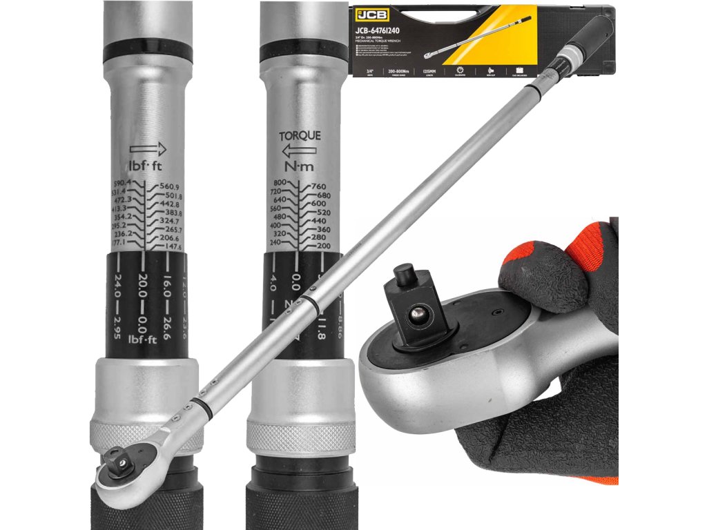 - Kľúče JCB garantujú výdrž 5 000 cyklov práce bez potreby kalibrácie. Tolerancia 4% , ergonomický zámok pre nastavenie momentu, lineárna metrická stupnica (Nm) a palcová (FLT) a vynikajúci dizajn – to sú prednosti série JCB, ktoré sa osvedčia v každej mechanickej dielni.