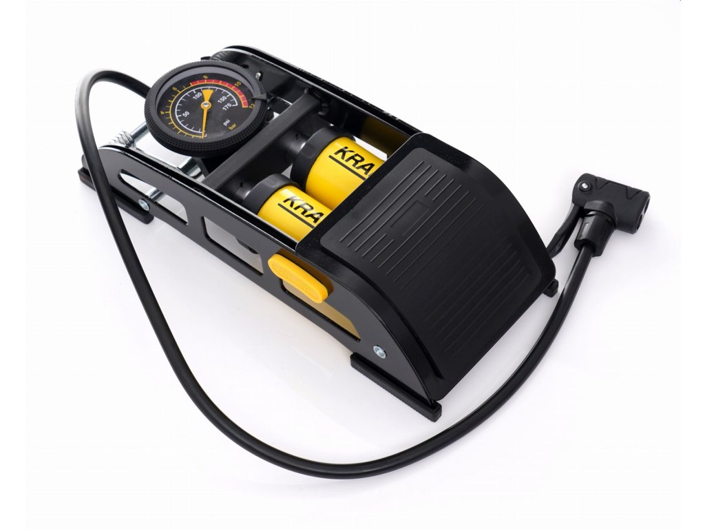 Nožná pumpa s manometrom značky Kraft&Dele model KD11824 je určená na rýchle nafúknutie alebo dofúknutie pneumatík na bicykli. Konštrukcia s dvojitým valcom zabezpečuje rýchlejšie fúkanie v porovnaní s obyčajnou pumpou s jedným valcom.