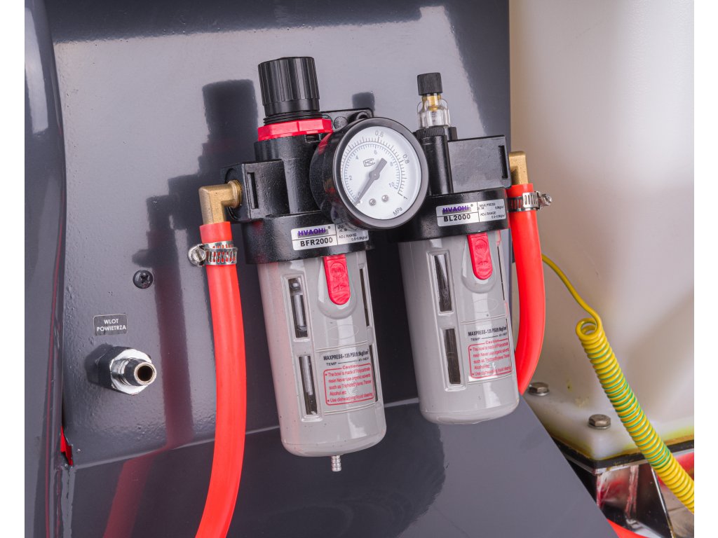 Dvojitý regulátor stlačeného vzduchu s manometrom, umožňujúci nastavenie správneho tlaku na výstupe až do 10 bar.