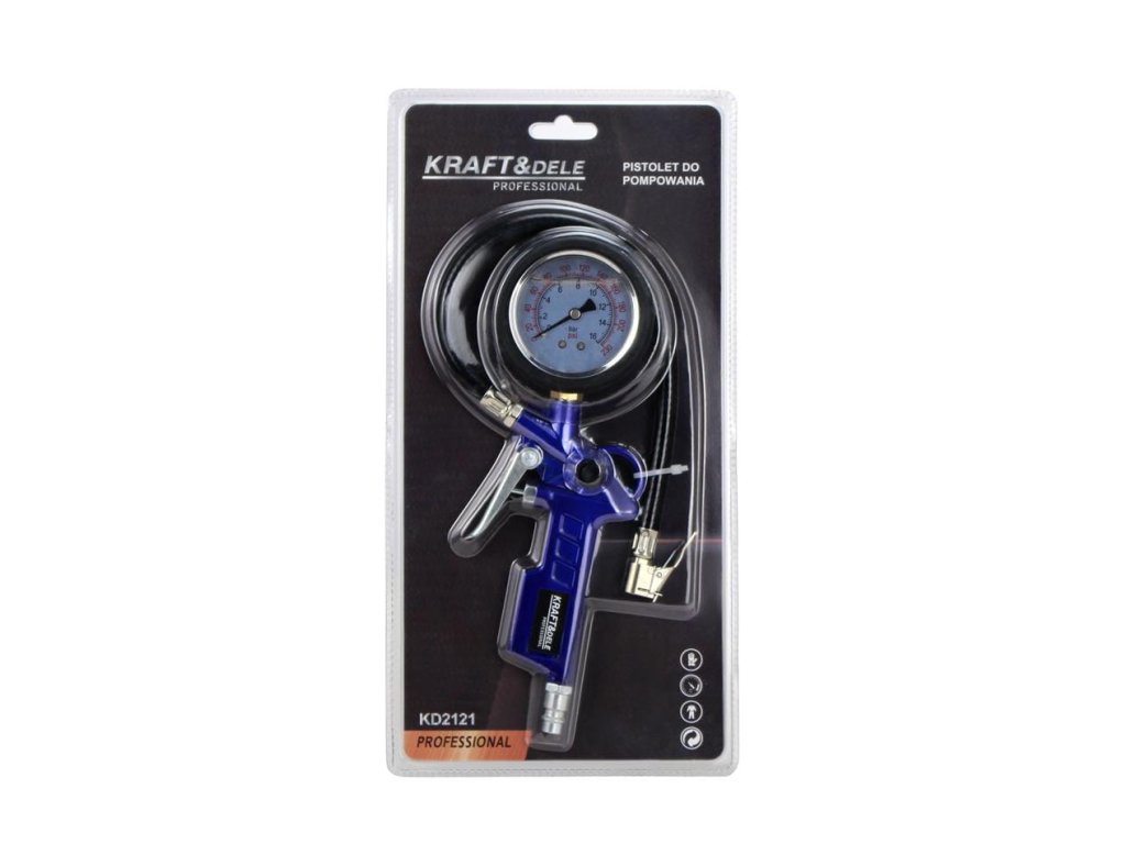 Pištoľ na dofukovanie vzduchu značky Kraft&Dele, model KD2121, je určená pre profesionálne použitie. Nový dizajn, jednoduché a pohodlné ovládanie. Ideálna na kontrolu tlaku vzduchu a dofukovanie všetkých typov automobilových kolies.
