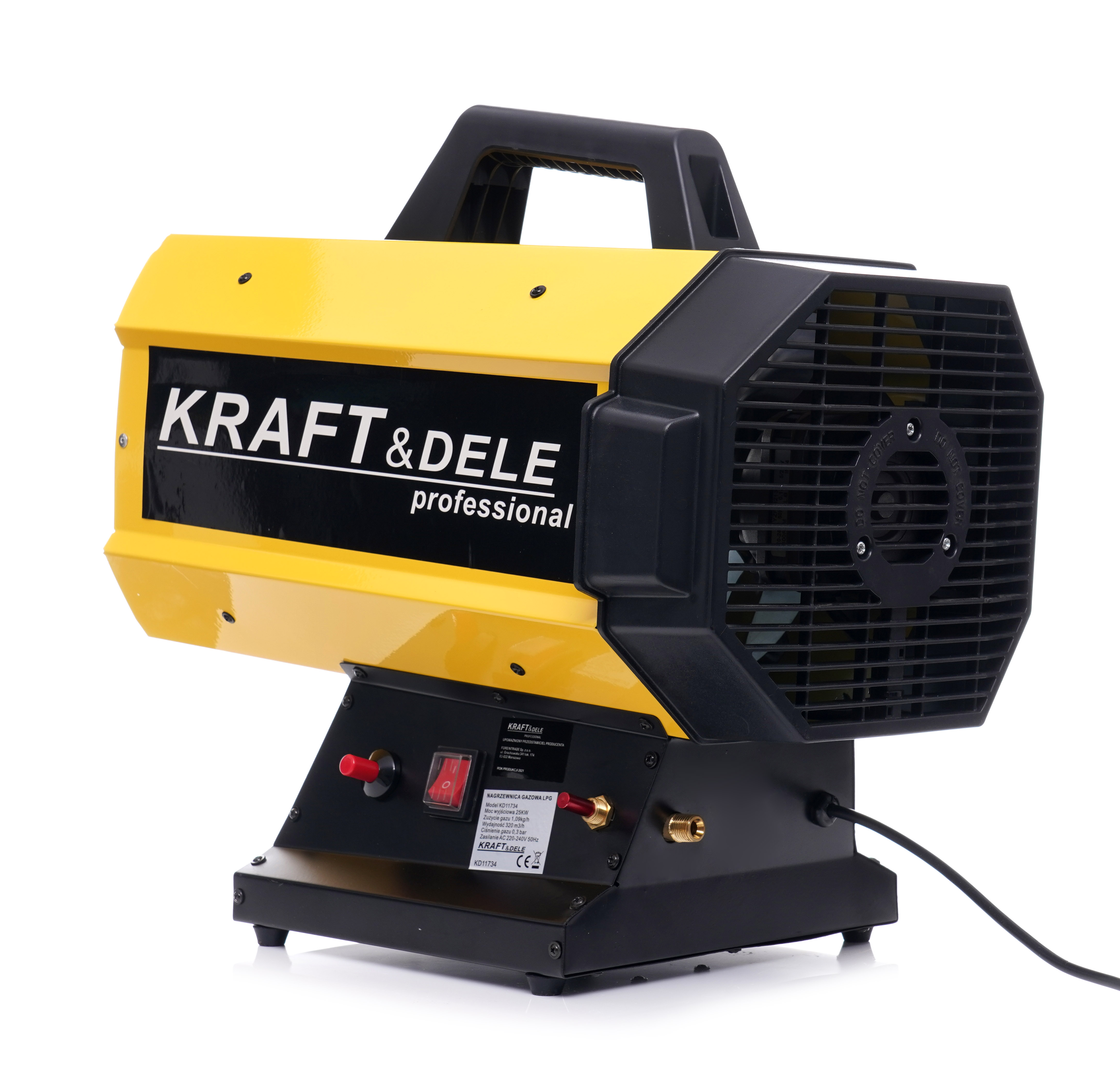 Plynový ohrievač značky Kraft&Dele, model KD11734, s výkonom 25 kW na propan-butan (LPG). Ohrievač je vybavený zabudovaným termostatom s reguláciou teploty. Zariadenie pracuje automaticky podľa nastavenej teploty.