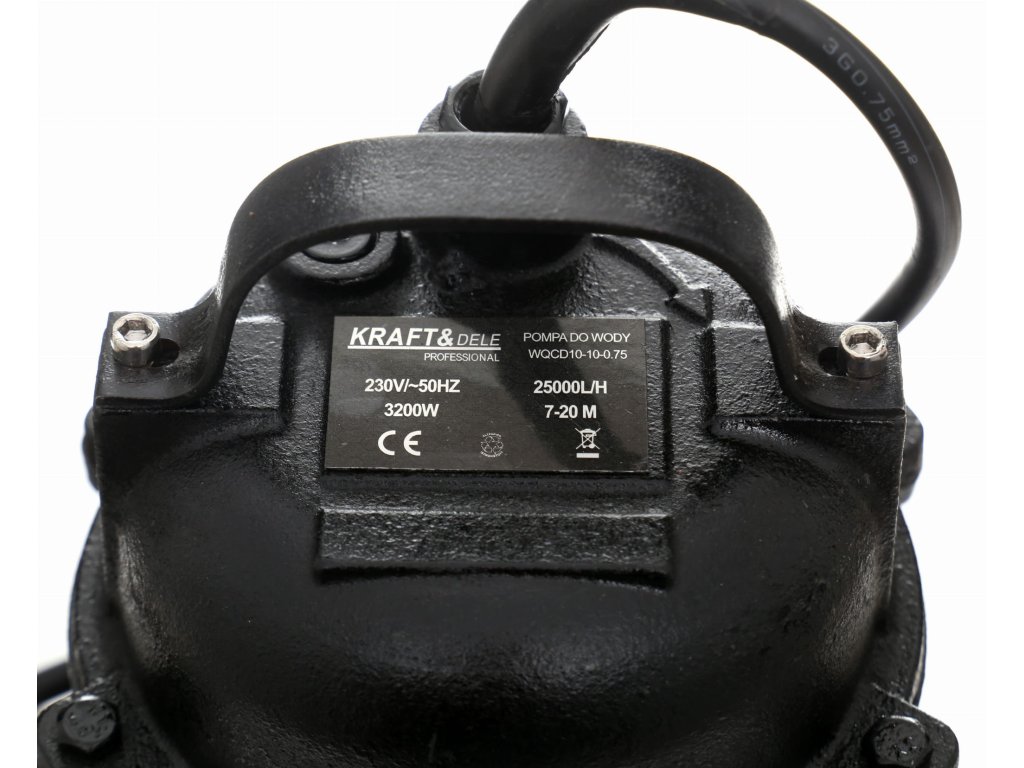 Ponorné čerpadlo na vodu s drvičom značky KRAFT&DELE s príkon-om 3200 W. Zariadenie poskytuje vysoký výkon a spoľahlivý prevádzkový chod.