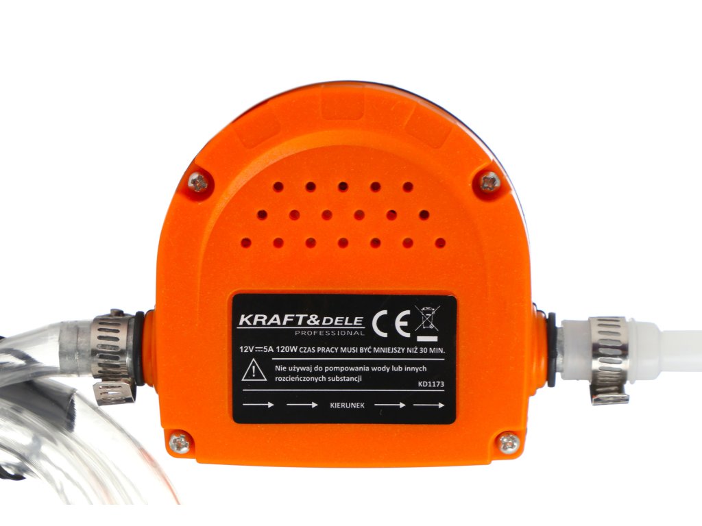 Prenosné čerpadlo KRAFT&DELE model KD1173 pre motorový olej/naftu je napájané 12V DC napätím, čo umožňuje jeho používanie tam, kde nie je prístup k hlavnému zdroju elektriny alebo stlačeného vzduchu.