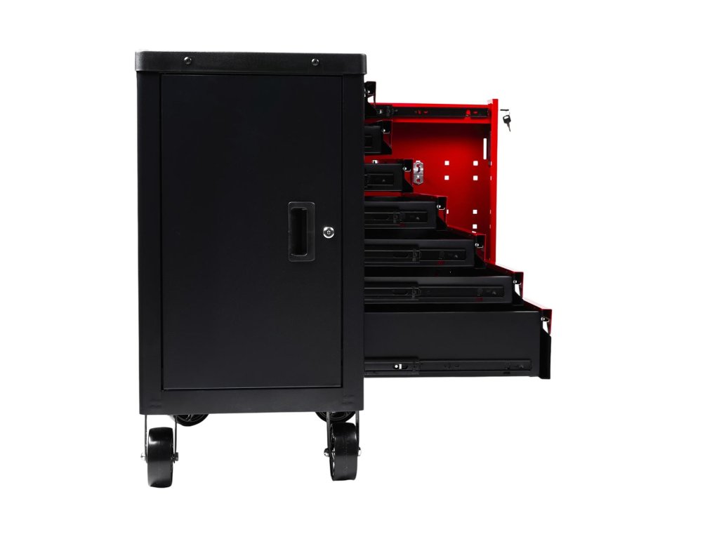 Má 9 priestranných šuplíkov . Šuplíky sú vybavené vodítkami a guličkovým mechanizmom pre ľahké vysúvanie. Každý šuplík má navyše zámok. Vozík je vybavený 2 otočnými kolesami , ktoré majú automatickú brzdu a zámok, čo znemožňuje pohyb skrine. Zaisťuje pohodlie a bezpečnosť aj na miernych svahoch.