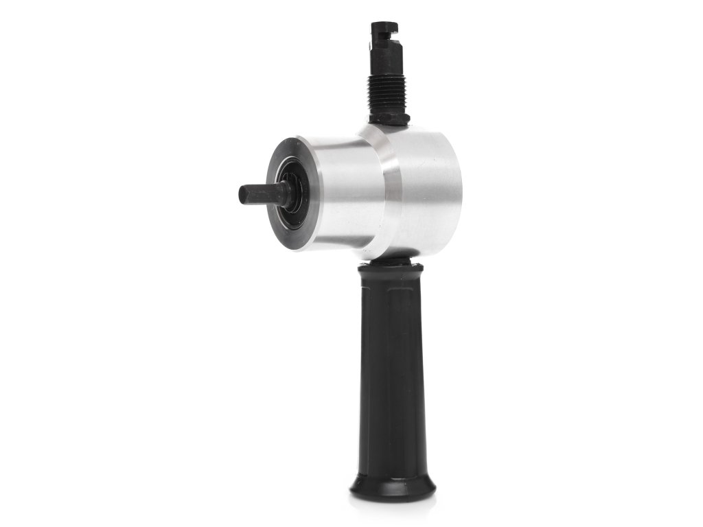 Nástavec na vŕtačku s možnosťou použitia pri rezaní kovového plechu. Veľmi jednoduchá konštrukcia a jednoduché použitie. Nástavec funguje na základe prestrihovača plechu, kde špeciálny nôž poháňaný otáčkami vŕtačky vykonáva posuvne spätný pohyb, ktorý rozdeľuje plech. Telo nástavca vyrobené z hliníka, mechanizmus z kalenej ocele. Šesťhranná hnacia hriadeľ.