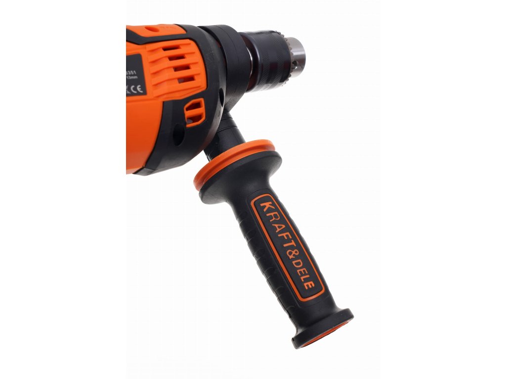 Elektrická príklepová vŕtačka Kraft&Dele KD3351 s výkonom 1600W je určená na príklepové vŕtanie do muriva, betónu a kameňa, rovnako ako na vŕtanie do kovu, keramiky, dreva a plastu. Hlavná rukoväť je vyrobená zo špeciálnej protišmykovej gumy, ktorá uľahčuje držanie náradia v ruke. Jedná sa o verziu vybavenú prídavnou bočnou rukoväťou. Hlavička je kovová.