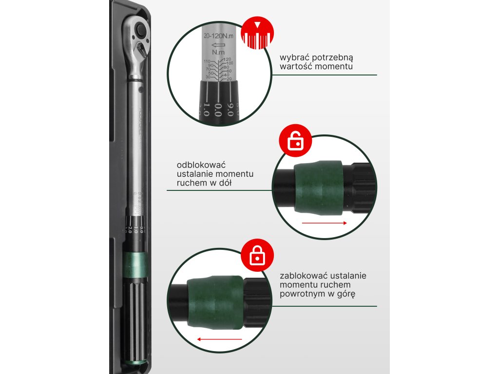 Rockforce obojstranný momentový kľúč 1/2" 20–120 Nm, CrV, s puzdrom a aretáciou