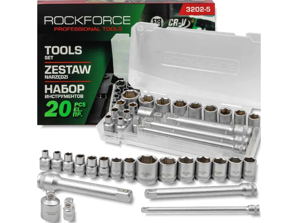 ROCKFORCE Sada nástrčných hlavíc 3/8", 20 ks, s adaptérmi a predlžkami