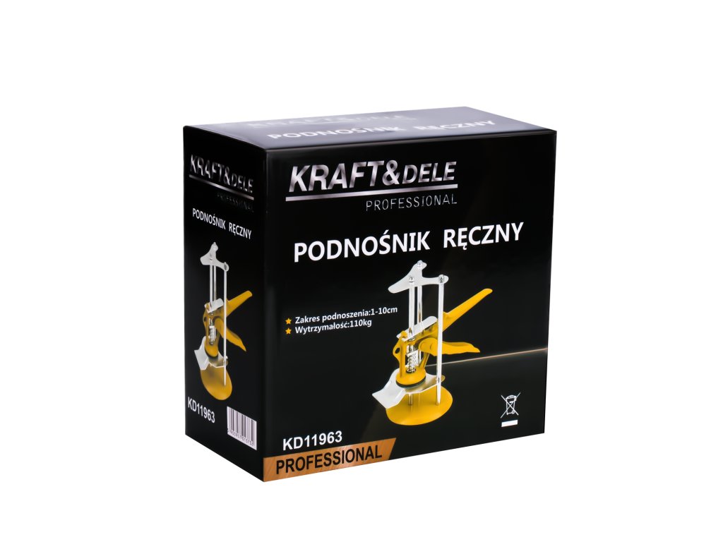 Profesionálny ručný zdvihák značky Kraft&Dele , model KD11963 , slúži na presné polohovanie – jednoduché a rýchle zdvíhanie a spúšťanie keramických, sklenených, mramorových dosiek, rovnako ako dverných alebo nábytkových rámov. Podpery uľahčujú položenie prvého počiatočného radu keramických dlaždíc na stenu, najmä pri veľkoformátových doskách, zaisťujúce ideálne vyrovnanie a rovinnosť. Zariadenie ponúka stupne voľnej regulácie, ktoré umožňujú presné polohovanie prvkov rôznych tvarov a rozmerov.