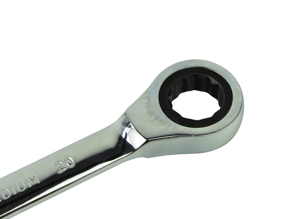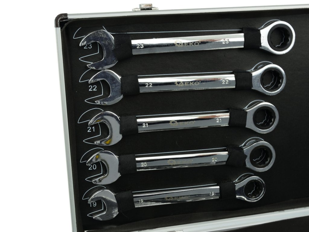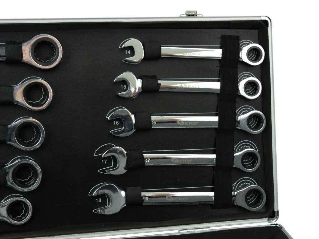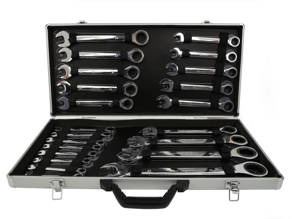 Veľká sada očkoplochých kľúčov s račňou (72 zubov) v rozmedzí veľkostí od 6 mm do 32 mm, vyrobených z odolnej chrom-vanádiovej ocele (CrV). Tieto vysokokvalitné kľúče sú ideálne ako pre profesionálne autoservisy, tak aj pre domáce dielne.