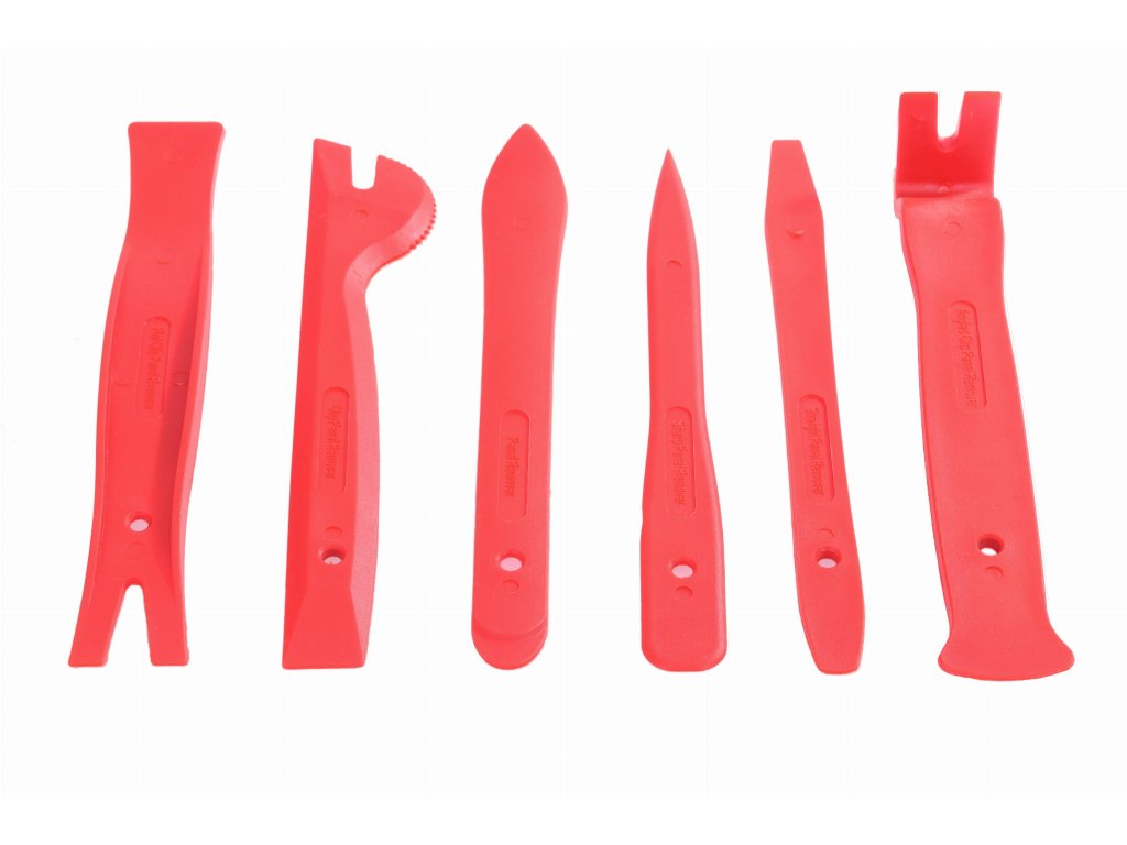 Sada na demontáž čalúnenia, 19 ks. Tieto odstraňovače sú vyrobené z vystuženého nylonu a majú špeciálne profily, ktoré umožňujú použitie páčidla pri demontáži čalúnených klips. Veľká sada rôznych odstraňovačov umožňuje výber vhodného nástroja pre konkrétnu situáciu, čo eliminuje riziko zlomenia úchytky, poškriabania alebo poškodenia čalúnenia.