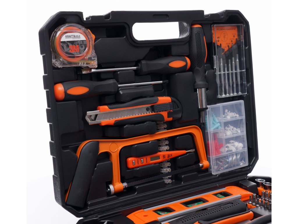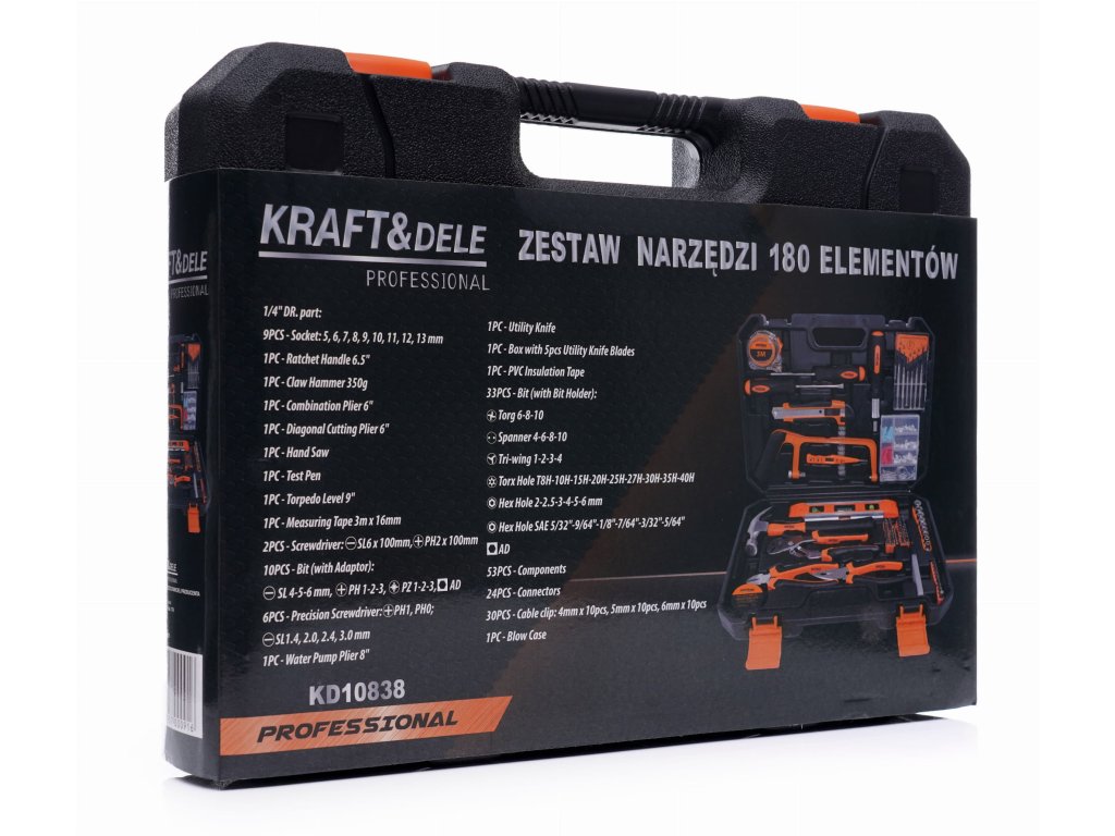 Veľmi rozsiahla sada náradia značky Kraft&Dele s označením Sada náradia 180 ks KD10838. Náradie sa vyznačuje solídnym spracovaním, odolnými materiálmi a praktickým kufrom, v ktorom má každé náradie svoje miesto.