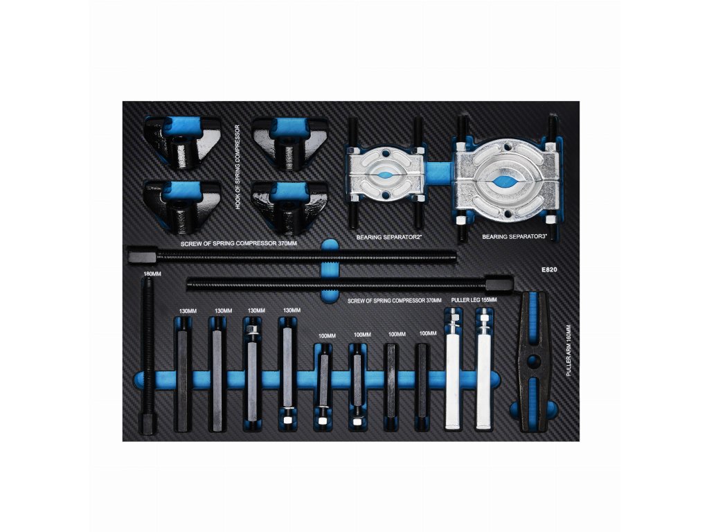 Obsahuje mimo iného odstraňovače pružín. Prispôsobené pre všetky typy pružín vo stĺpcoch McPhersona a nezávislých pružinách. V zásuvke sú tiež odstraňovače ložísk.