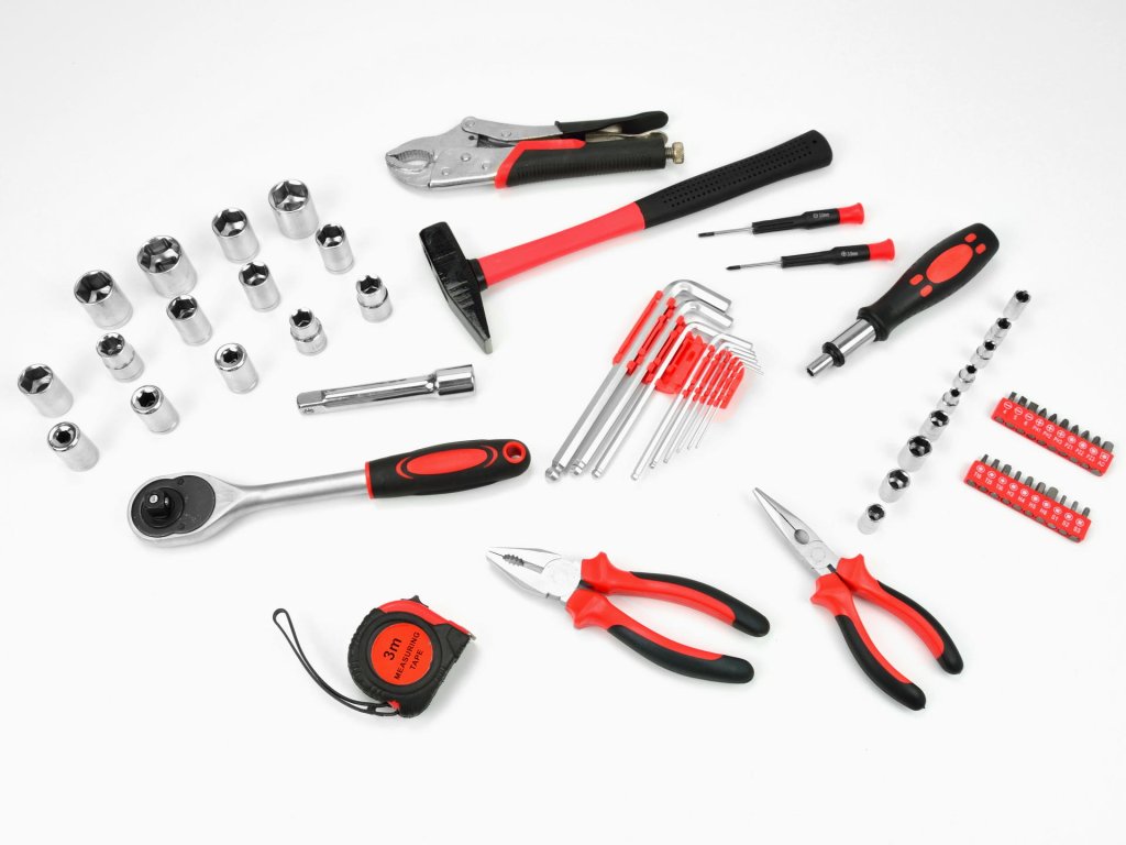 Sada náradia s vybavením 64 ks v kovovom boxe G10850 obsahuje 64 prvkov užitočných pri domácich opravách, montáži nábytku a ďalších opravárenských prácach. V sade nájdete okrem iného šesťhranné nástrčné kľúče 1/2" a 1/4", kliešte, kombinované kliešte, imbusové kľúče, svorky, zámočnícke kladivo, sadu bitov, presné skrutkovače, svinovací meter a ráčnový kľúč.