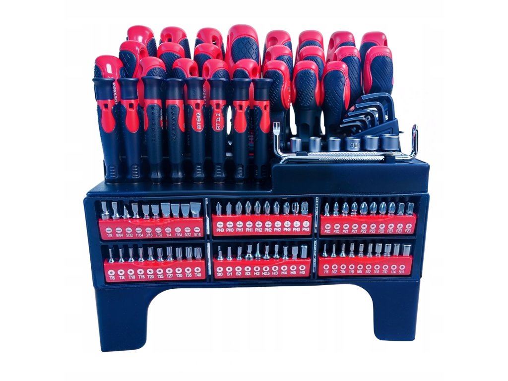 Súprava je doplnená praktickým stojanom pre ľahké usporiadanie náradia a magnetickou miskou, ktorá zabraňuje strate drobných kovových súčiastok. Ergonomické rukoväte s protišmykovým povrchom zaisťujú pohodlné a bezpečné držanie pri práci.