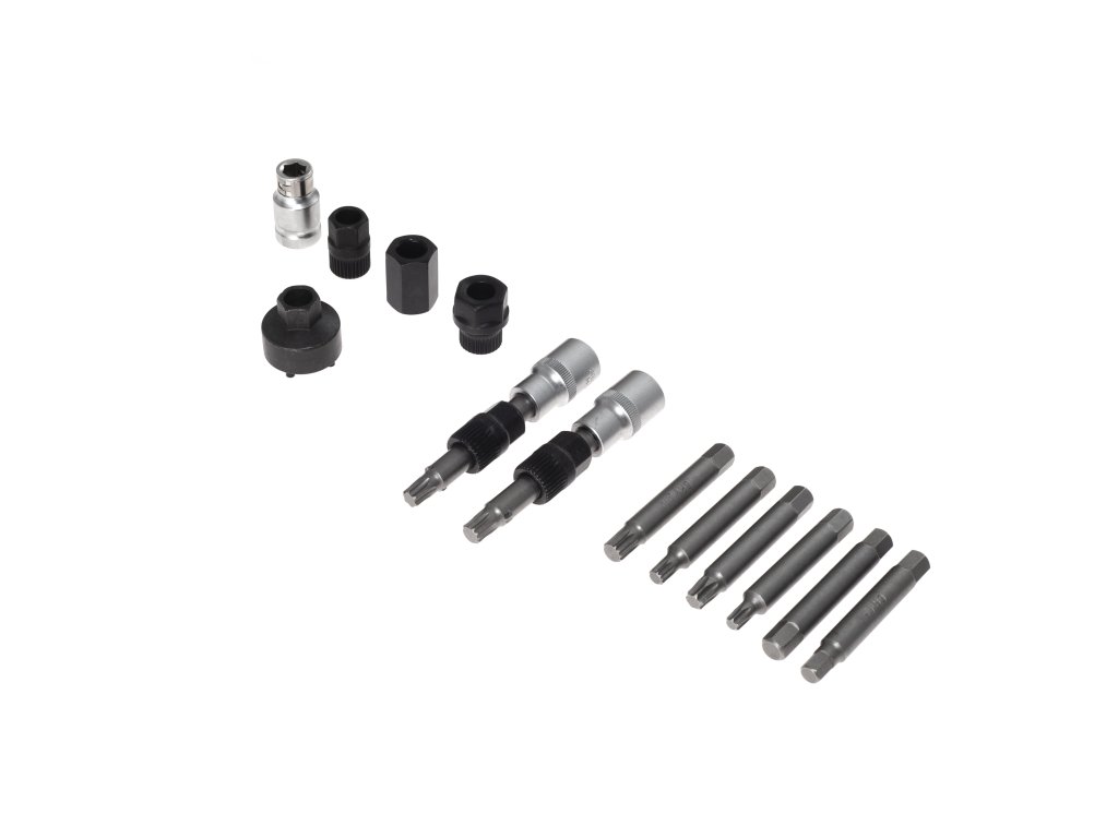 Sada kľúčov umožňuje súčasné odskrutkovanie skrutky upevňujúcej remenicu pomocou zodpovedajúcich bitov, zatiaľ čo zároveň držite koleso so spojkou. To značne zjednodušuje proces montáže a demontáže alternátorov.