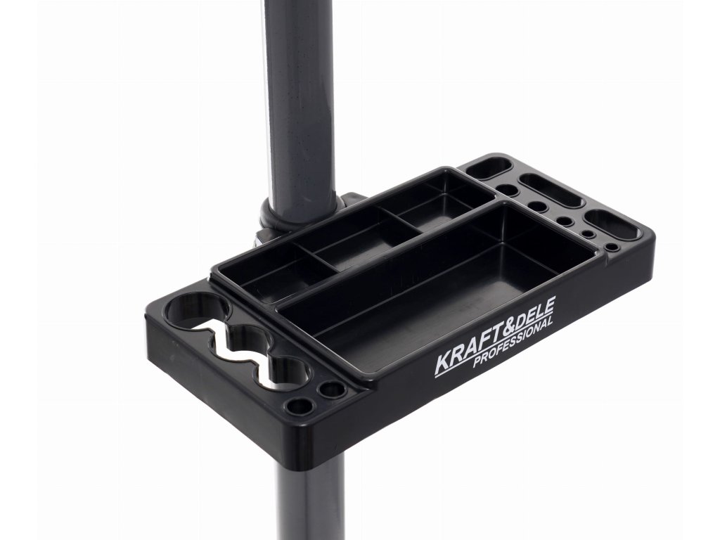 Stabilná konštrukcia z kvalitného kovu zabezpečuje bezpečnosť počas vykonávania opráv. Hlavnou výhodou tohto produktu je nastaviteľný tácek na náradie. Pri oprave máte nevyhnutné nástroje stále po ruke.