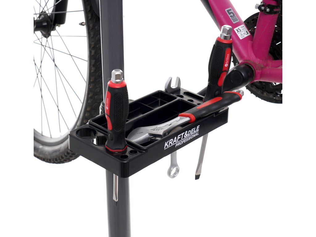 Praktický servisný stojan model KD11252 umožňuje pohodlnú opravu všetkých typov bicyklov, vrátane nadrozmerných a tých s Y rámom. Je vhodný aj pre elektrické bicykle, maximálna nosnosť až 30 kg. Bezpečný, ergonomický a pohodlný stojan chráni vaše chrbát a výrazne uľahčuje prácu.