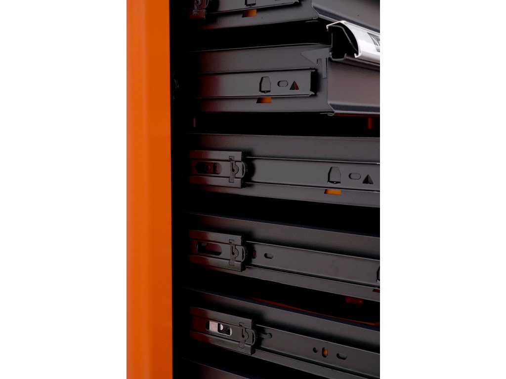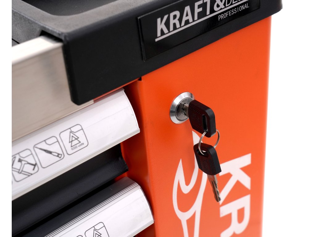 Skriňa je zabezpečená proti krádeži centrálnym zámkom, ktorý uzamkne všetky zásuvky pomocou dvoch kľúčov. Navyše sú zásuvky vybavené individuálnymi zámkami. Aj napriek väčšej váhe je skriňa ľahko prenosná vďaka 4 otočným kolieskam s brzdou a zámkom.