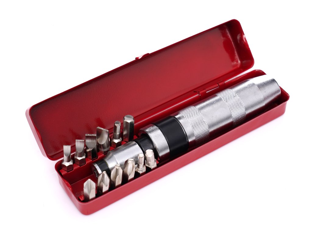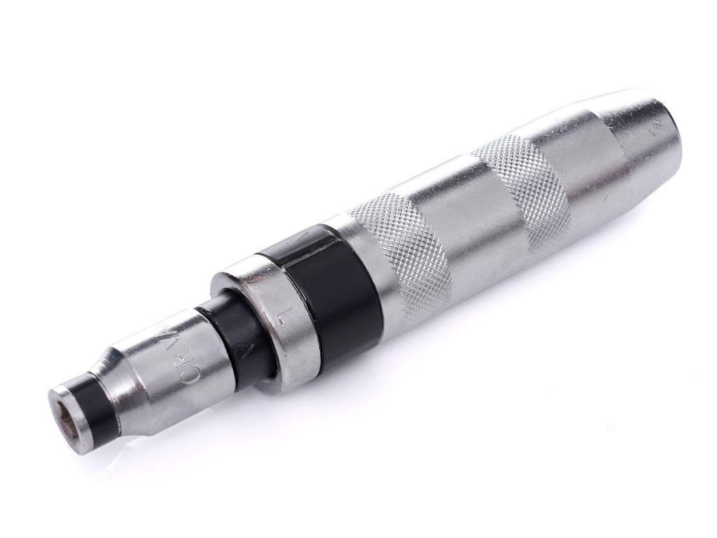 Sada obsahuje univerzálny držiak, na ktorom sa na konci montujú vymeniteľné koncovky s možnosťou nastavenia smeru otáčania vpravo/vľavo.