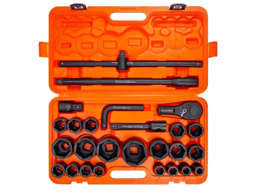 Profesionálna sada nástrčných kľúčov 3/4" + 1". Ideálne pre veľké nákladné vozidlá aj poľnohospodárske stroje, vyrobené z pevných materiálov, čo sa prejavuje v ich odolnosti. Nevyhnutná v každej automobilovej dielni - nástrčné hlavice tejto veľkosti pomôžu pri opravách kamiónov alebo poľnohospodárskych strojov. Ideálne pri povoľovaní alebo doťahovaní veľkých skrutiek. Všetky hlavice a redukcia sú uložené v praktickom kufríku. Sada obsahuje 26 dielov. Kufrík zaisťuje bezpečný transport a bráni samovoľnému otvoreniu.