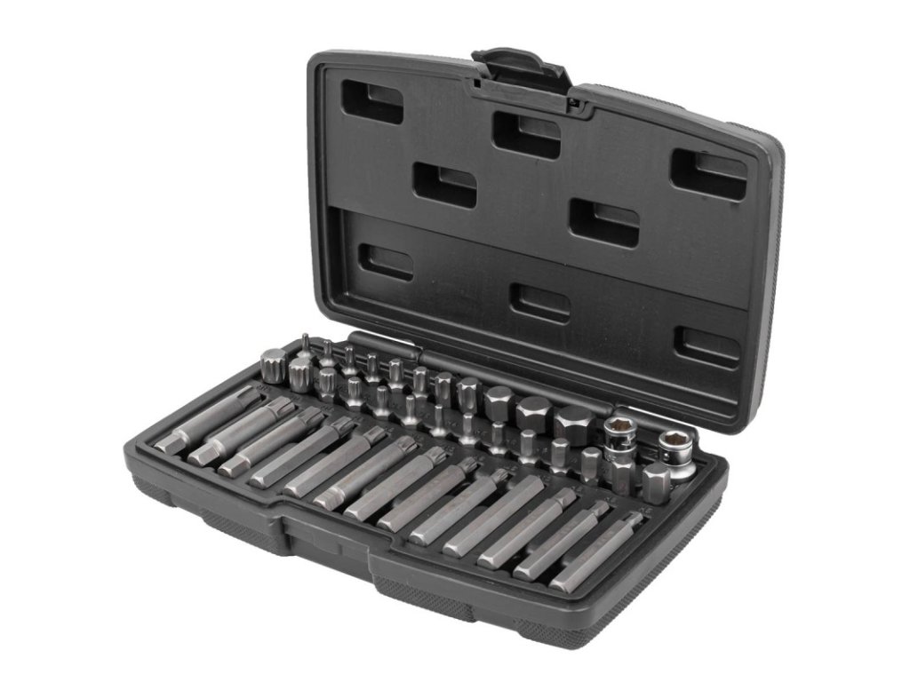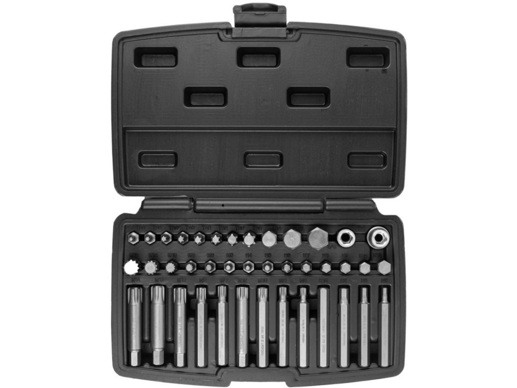 Profesionálna sada bitov určená na povoľovanie špeciálnych skrutiek typov: hex, torx, spline. Rôznorodosť bitov umožňuje vykonávanie mnohých prác v odborných mechanických a automobilových servisoch. Bity vyrobené z chróm-vanádiovej ocele, trieda 50BV30 , do ktorej boli pridané špeciálne prímesi kovov za účelom zaistenia najlepších fyzikálnych a mechanických vlastností, čo zaručuje vysokú odolnosť a spoľahlivosť. Sada je dodaná v praktickom plastovom kufríku na prepravu a skladovanie.