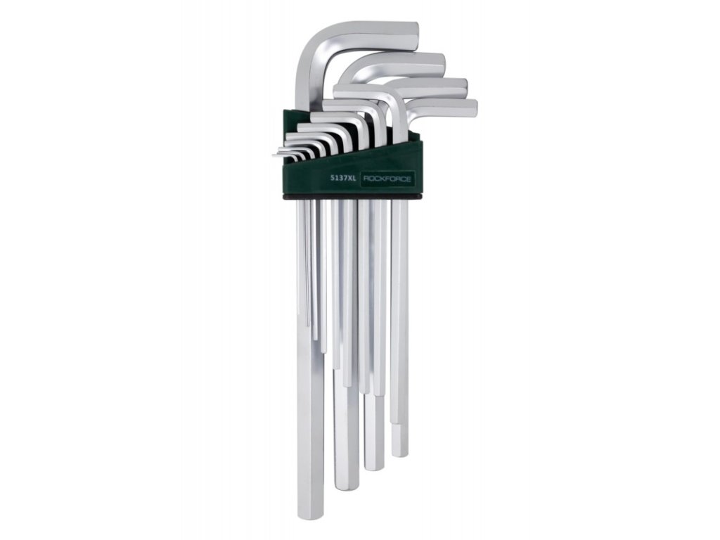 Praktická sada imbusových kľúčov uložená v praktickom a skladnom plastovom držiaku, ktorý uľahčuje nájdenie správnej veľkosti kľúča.
