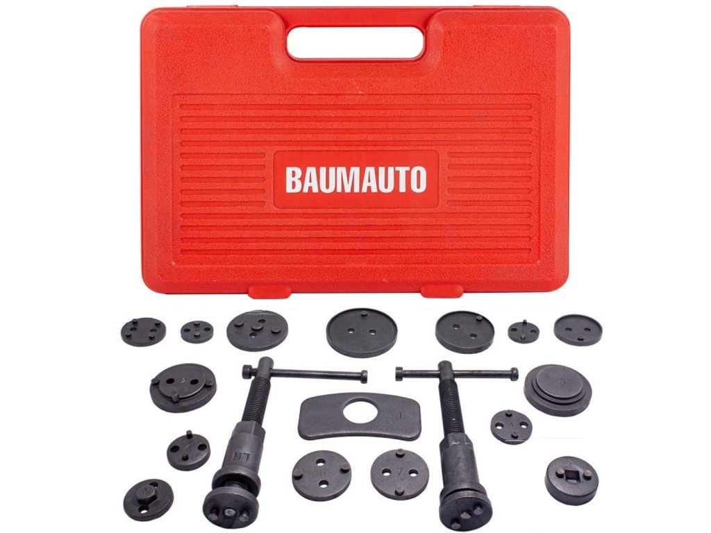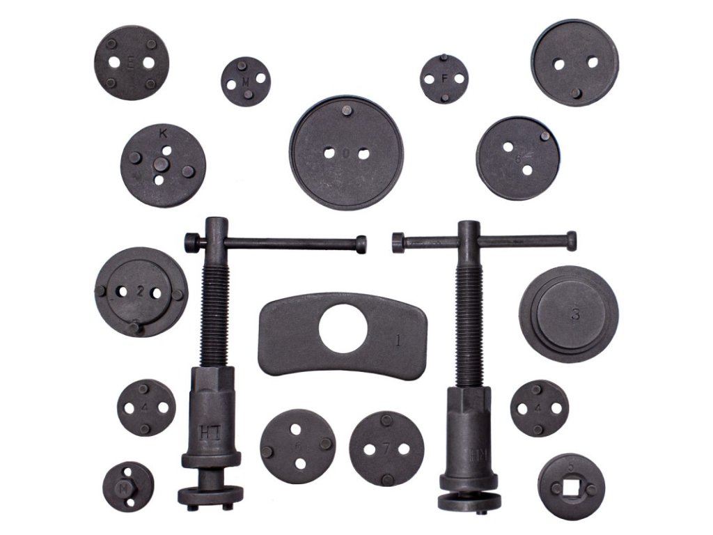 Nevyhnutné pri opravách vozidiel vybavených kotúčovými brzdami. Súprava slúži na spätné zasúvanie (stláčanie) piestov v brzdových strmeňoch. Presné prispôsobenie adaptéra a piestka zaručuje správne zasunutie piestka do valca strmeňa.
