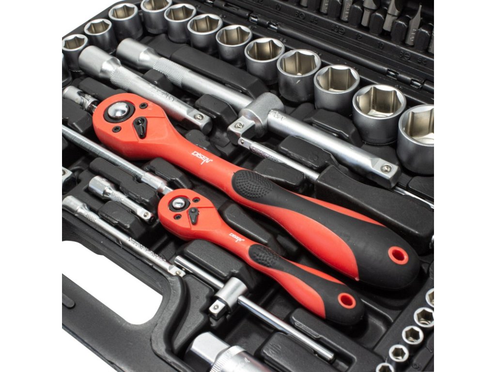 Sada obsahuje profesionálne račne založené na pevnom a presnom mechanizme so 72 zubami, určené na prenášanie veľkých zaťažení. Vyrobené z vysoko kvalitnej chróm-vanádiovej ocele, potiahnuté plastom. Račne sú navrhnuté tak, aby vydržali intenzívnu prácu v najťažších podmienkach. Dvojvrstvová kompozitová rukoväť zaisťuje pohodlie pri práci a istý úchop, uľahčuje manévrovanie račňou. Plastová vrstva tiež chráni lakované povrchy pred poškriabaním. Vysoko kvalitná oceľ CrV. Praktické tlačidlo na uvoľnenie hlavice.