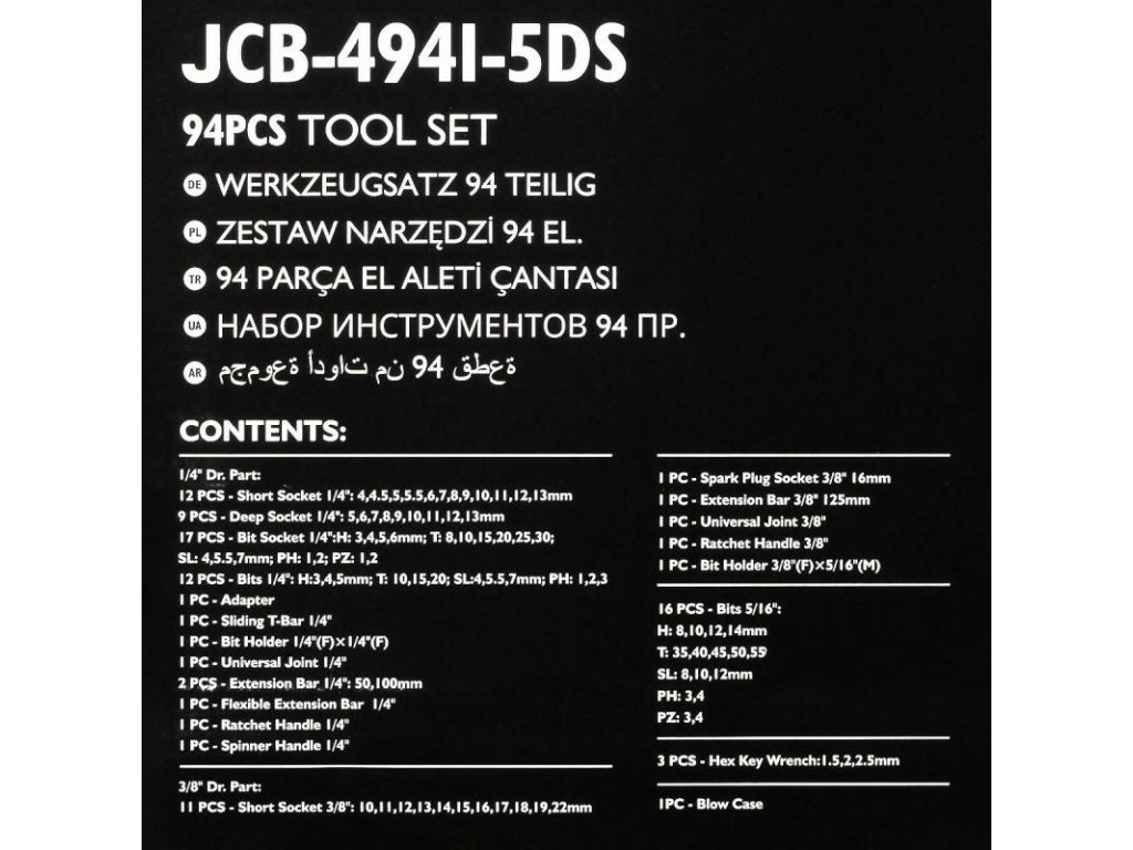 - 13 ks nástrčných hlavíc: 4, 4.5, 5, 5.5, 6, 7, 8, 9, 10, 11, 12, 13, 14 mm